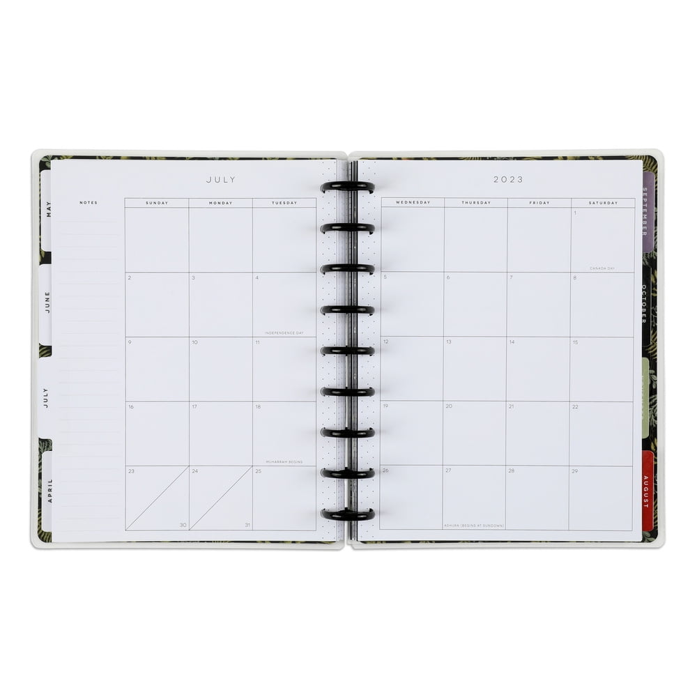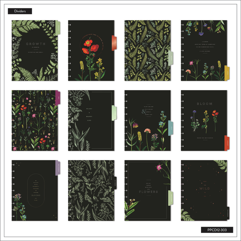 This 12-month planner includes dated monthly calendars and weekly spreads. This planner comes with a sturdy laminated covers and plastic discs. The 12 dividers feature deep botanical floral prints and inspirational quotes. -
