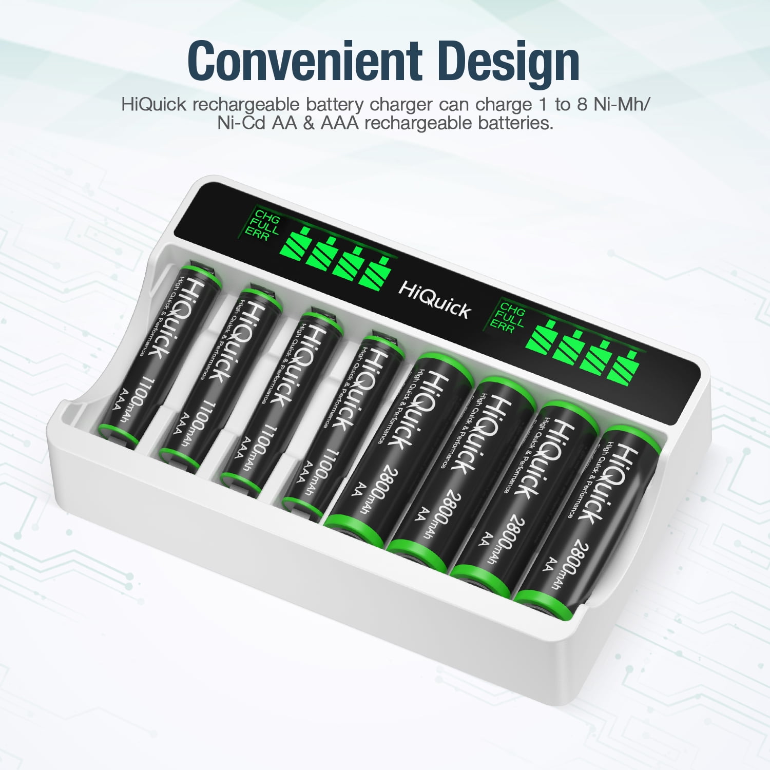 - HiQuick rechargeable battery charger designed with LCD screen which can show for you the whole process of battery charging.