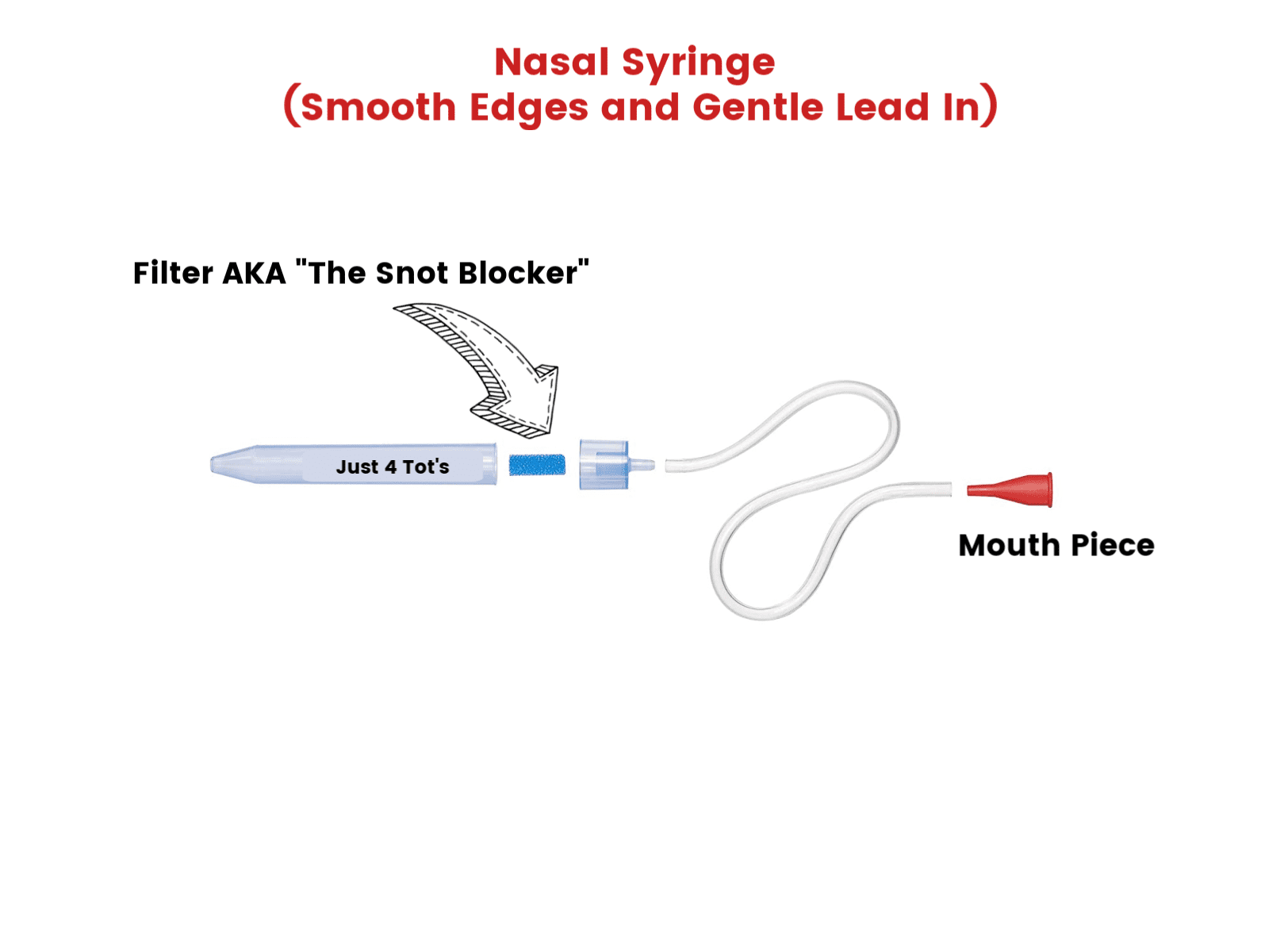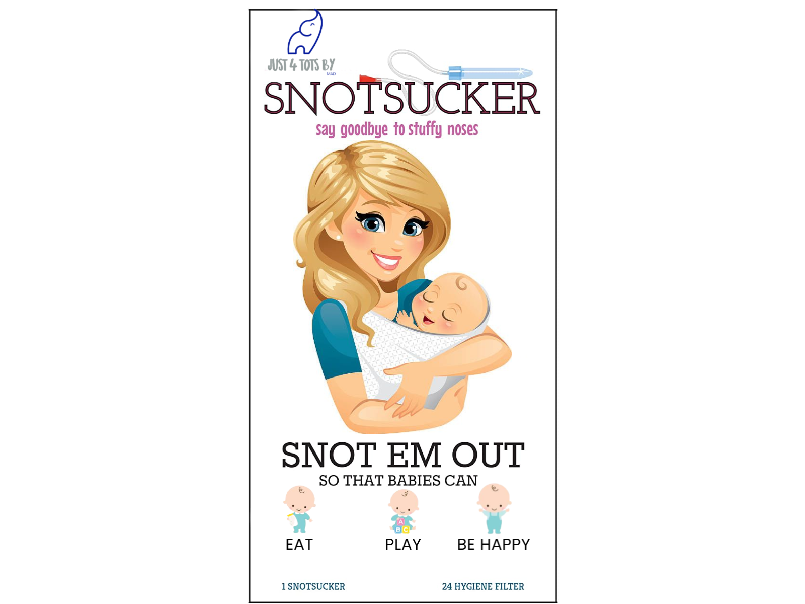 Just4Tots by MAD Baby Nasal Aspirator The Snot Sucker with 24 Extra Filters from Just 4 Tot’s by MAD | Compare us to Nose Frida Baby nasal Aspirator ring organic banana bibs fruit feeder pacifier cloth toddler bandana ice drool newborn munchkin fisher price mitten necklace popsicle rubber bebes giraffe holder molar back silicon sensory corn clip training frida oral dr brown gummy self hygiene cactus baby teetherJust 4 Tot’s Nasal Aspirator "Snot Sucket is the only way to clean baby’s nose, its non-invasive, Hygienic and Pediatrician recommended. The Hygienic filters, the snot trap, prevent mucus from bypassing the syringe and into your mouth, effectively preventing mucus or bacterial transfer. The device is doctor-invented and believe it or not the nasal aspirator actually works! To Use: Place large tube against child’s nostril (not inside), creating a seal. Use red mouthpiece to suck out snot. Tips: (1) Spraying saline solution in each nostril will help loosen thick mucus before using Just 4 Tot’s. (2) Move tube in a circular motion against nostril. You will hear and see mucus coming out of nose. (3) Change filter after each use to maintain suction. Compare us to Nose Frida!!