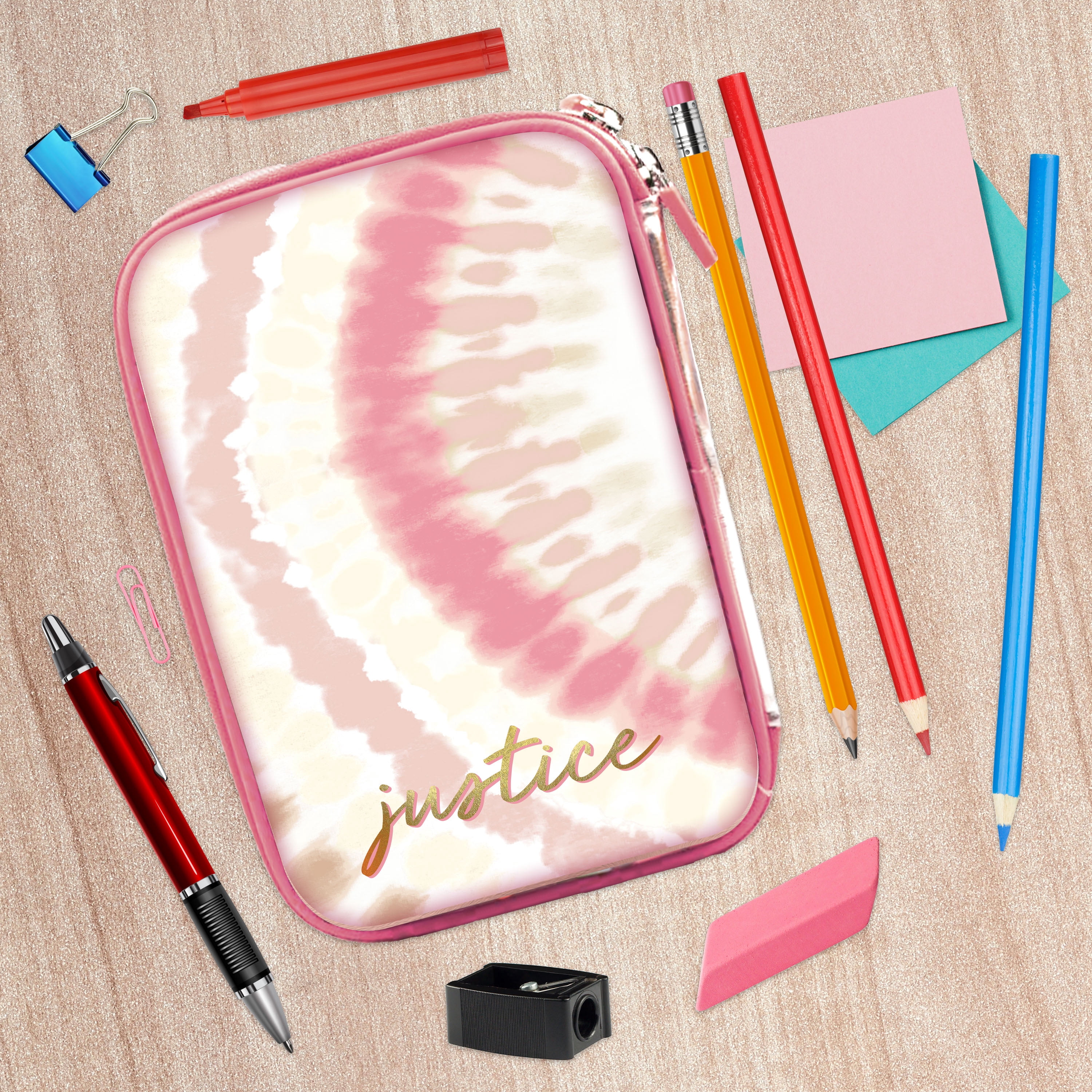 A splash of varying tones of pink and white cover the front of the pouch. The front shell of the pouch is a metallic rose gold color. It can be used for everything from pencils to paperclips. The pouch makes a perfect money holder or beauty product storage bag too.