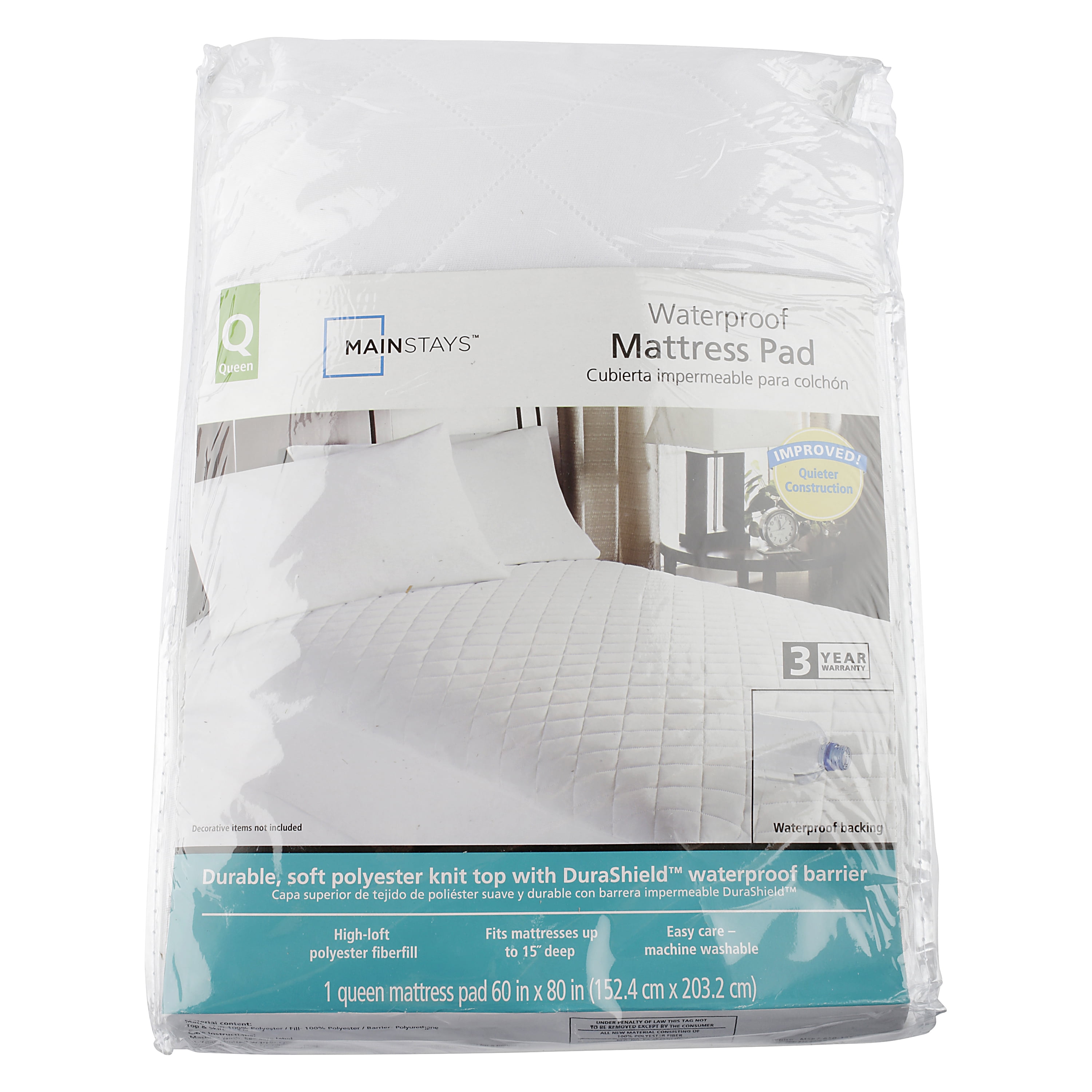 Protect your mattress and help it last longer with this Mainstays Waterproof Mattress Pad Queen. It features a DuraShield waterproof barrier to protect your mattress from stains and wetness. The high-loft polyester fiberfill makes this Mainstays mattress pad comfortable, while improved construction makes it quieter. The knit top is made of durable, soft polyester to keep you comfortable. This Mainstays Waterproof Mattress Pad Queen fits mattresses up to 15" deep. It’s machine washable to make cleaning and maintaining it convenient and easy. This mattress pad is ideal for those who want to get the absolute most out of their mattress, or for mattresses that are in high-traffic areas. Comes with a 3-year warranty.