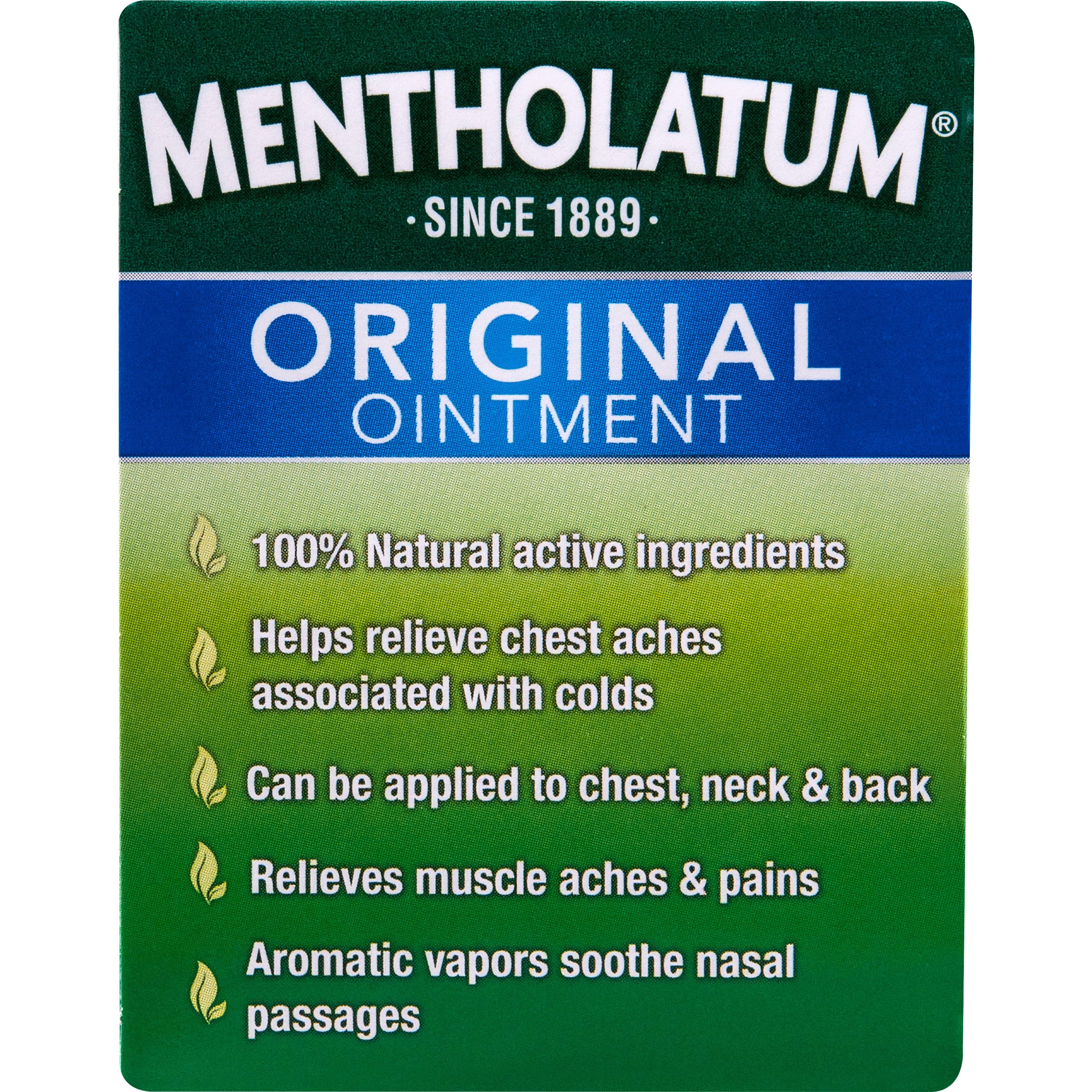 Get immediate relief from cough and cold symptoms and more with Mentholatum Original Ointment. This soothing salve is specially made with 100 percent natural active ingredients to provide a soothing sensation instantly upon application. Mentholatum Original ointment contains camphor and menthol, both of which are known to be topical analgesics. Its aromatic vapors help soothe nasal passages and relieve inflamed sinuses; when used as a pain rub, its ultra-strength formula can help relieve back pain, joint and muscle soreness and arthritis. The topical analgesic rub is safe for use on adults and children ages 2 and up. Each jar contains 3 oz.