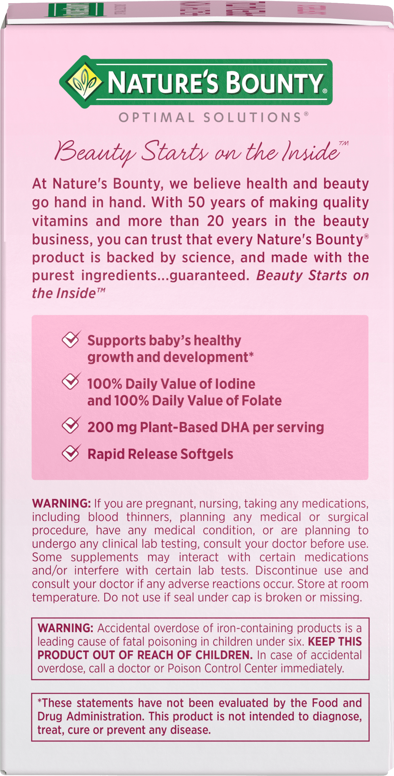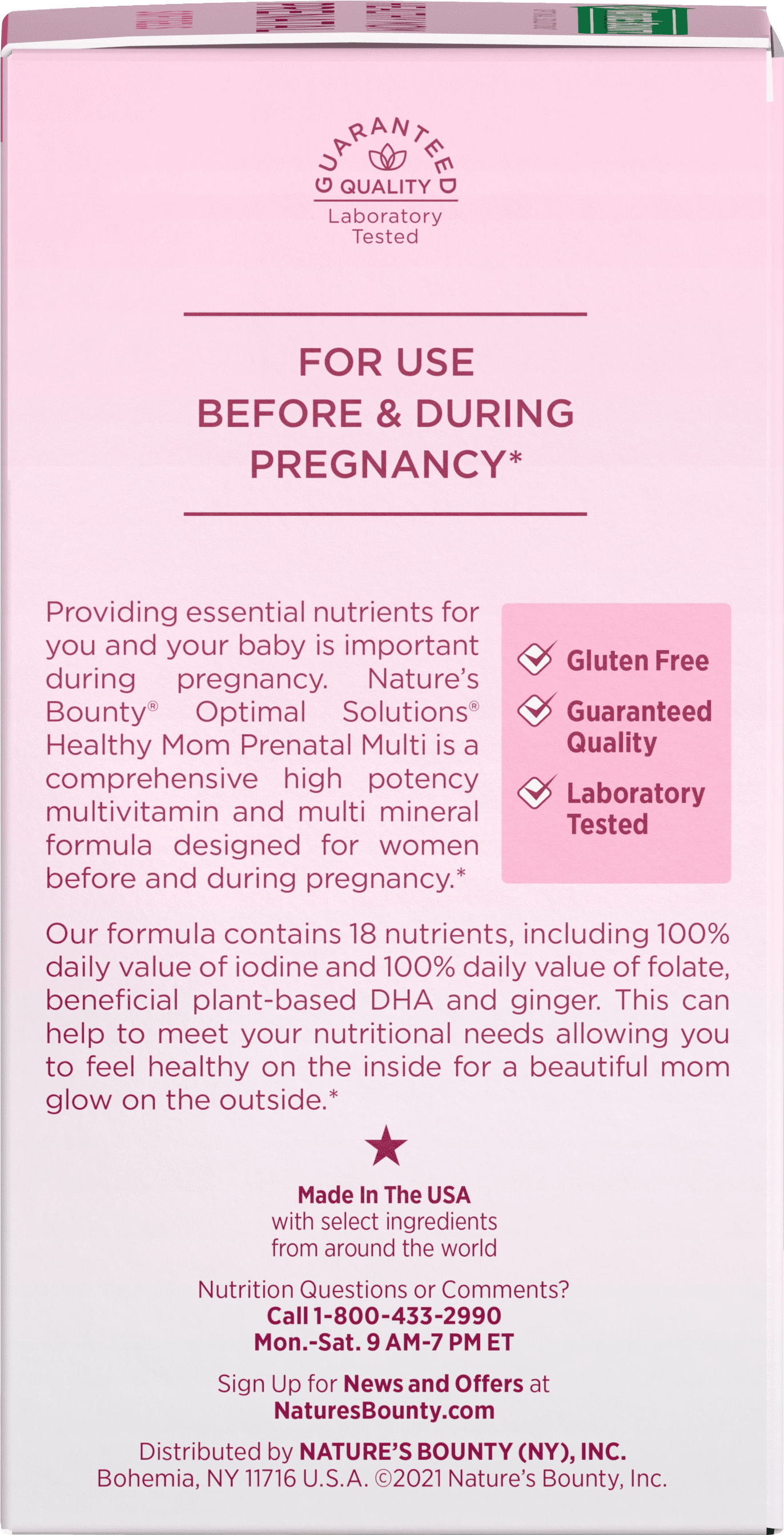 Providing essential nutrients for you and your baby is important during pregnancy. Nature’s Bounty Optimal Solutions Healthy Mom Prenatal Multi is a comprehensive high potency multivitamin and multi mineral formula designed for women before and during pregnancy.* Our formula contains 19 nutrients, including 100% daily value of iodine and folic acid, beneficial plant-based DHA and ginger. This can help to meet your nutritional needs allowing you to feel healthy on the inside for a beautiful mom glow on the outside.* Packaging may vary