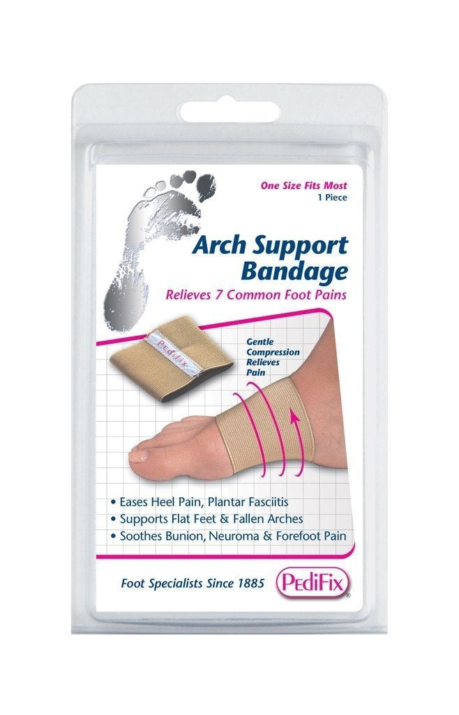 Pedifix Arch Bandage (Pack of 2)Arch Bandage supports fallen arches and flat feet and eases related toe, ball-of-foot and heel pain. It is helpful for bunions, neuromas, plantar fasciitis, and heel spurs. This soft, elastic bandage gently squeezes the arch to provide support and extra stability to sore and tired feet. Makes shoes more comfortable. Washable, reusable and effective for months.