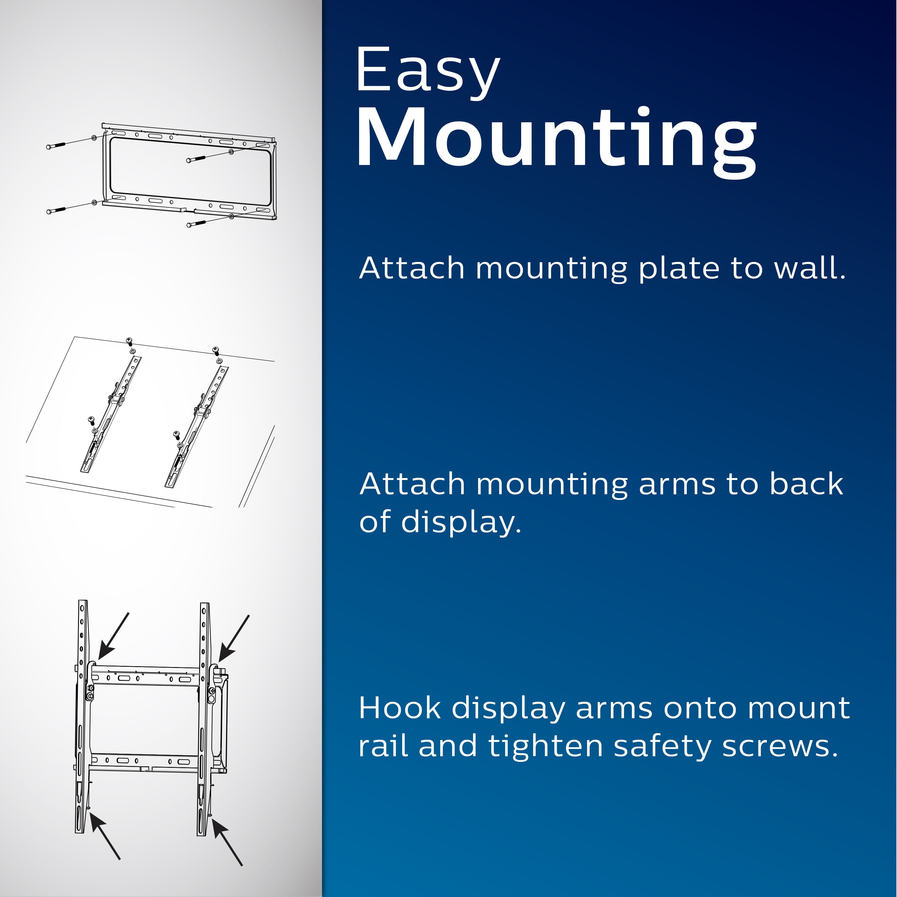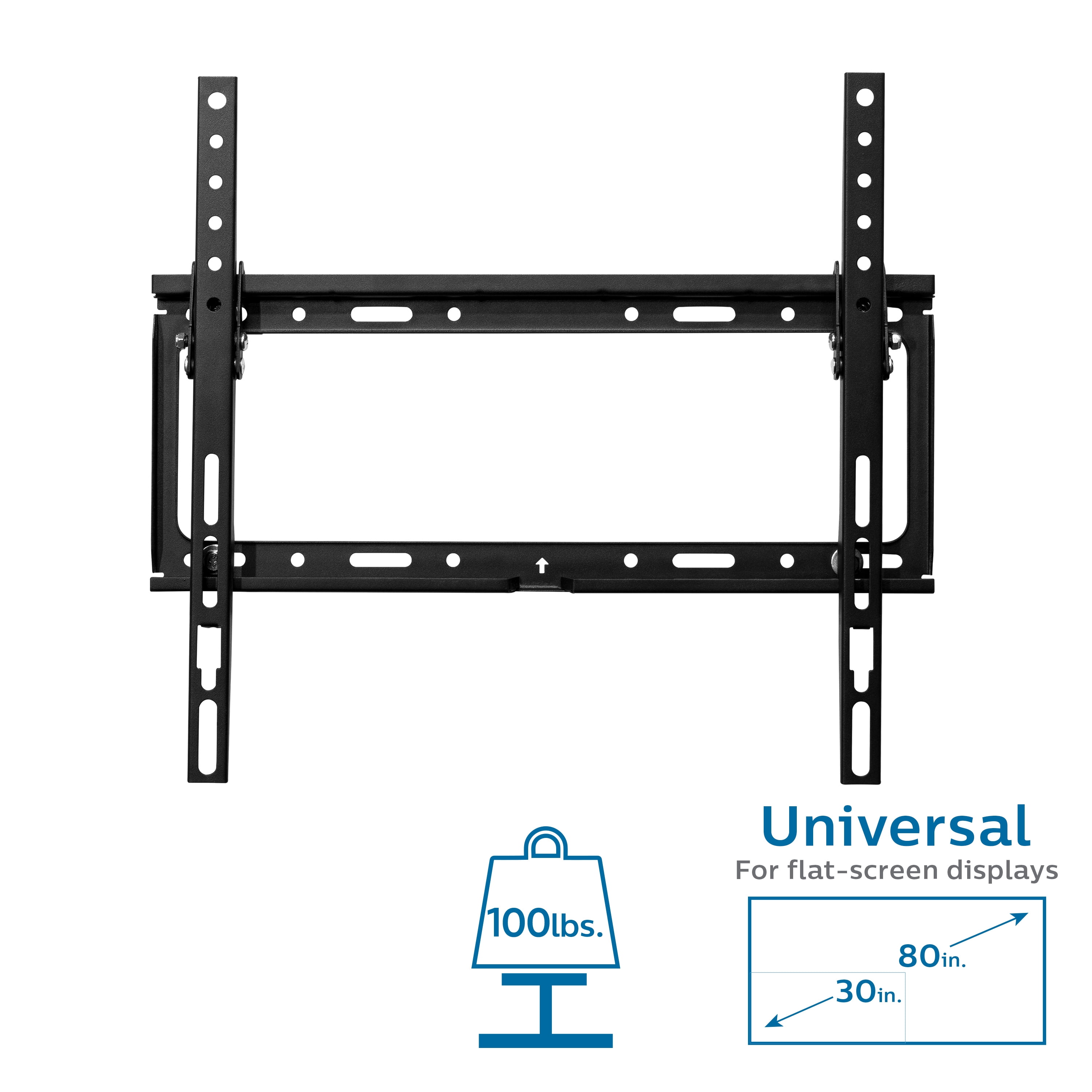 Fortify your favorite flat screen with the Philips Tilt TV Wall Mount. This tilt mount comes with mounting hardware and installs in minutes so you can enjoy your favorite shows or catch the big game in no time. And, the lockable safety bar ensures your valuable display stays put and is protected against theft. The thin-profile, space-saving design is exceptionally strong and supports 30-80in. flat-screen TVs weighing up to 100lbs. It also features a VESA-compatible mounting pattern of up to 400mm x 400mm. With flexibility to tilt 1 degree up and 3 degrees down, your TV installs securely and can be adjusted to the perfect angle. Safeguard the star of your entertainment space with the Philips Tilt TV Wall Mount.