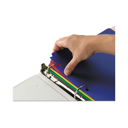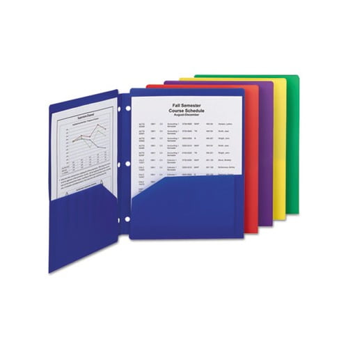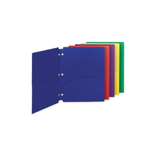 These two-pocket folders are three-hole punched with slits to allow for easy snap in and out of three-ring binders. Put them anywhere within your binder without having to open the rings. Bright colors make it easy to color code by subject or project. Durable polypropylene resists tears and moisture and is easy to clean. Front Cover Colors: Assorted Color Family: Multicolor Back Cover Colors: Assorted Sheet Size: 11 x 8 1/2.