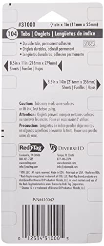 Quickly index stacks of documents with Redi-Tag Write-On Index Tabs. Made of heavy-duty, durable plastic, these permanent adhesive tabs allow you to turn any page of a document or manual into an index divider. No need to take apart or ruin the bind, simply stick the tab on the edge of any sheet. Easily write on tabs with pen, pencil, or permanent marker. These index tabs eliminate the need for bulky divider sheets and won’t curl or tear. They are ideal for creating long lasting, custom indexes. Grid on the package allows for accurate tab placement.Redi-Tag Side-Mount Self-Stick Plastic Index Tabs, 1 Inch, White, 104/Pack (31000)