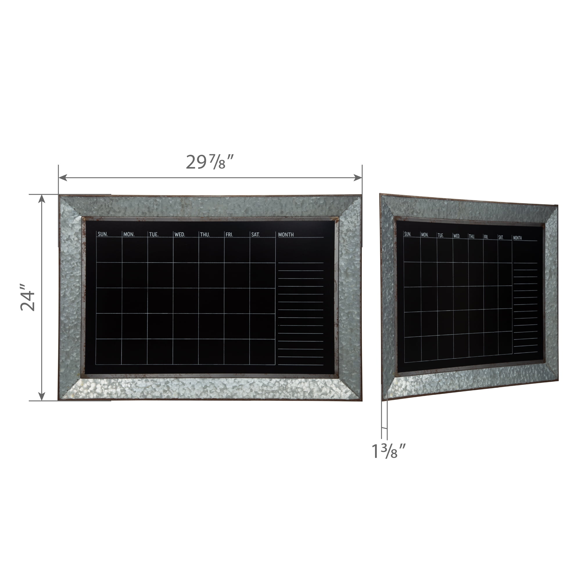 Keep the whole family organized in style with the Rustic Galvanized Metal Framed Wall Mount Chalkboard Calendar. This wall mounted blackboard features a monthly calendar to plan events, remember important dates and keep track of everyone’s schedule. It’s distressed 3.25 inch galvanized metal frame also makes it a rustic wall decor piece that adds charm to any space. The chalkboard finish easily wipes clean with a damp cloth and it hangs securely to any wall surface with two metal hangers on the back. This wall calendar is perfect for use in the entryway, home office, or kitchen. Use it to post all of your important appointments, birthdays and shopping lists while also adding a farmhouse modern element to your decor.