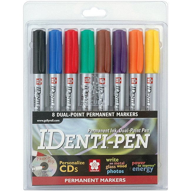 Identi-Pen pen-style, dual-tip, permanent marker 8-pieces set. Each marker has dual-tip fine and extra-fine points, and a handy pocket clip. 1 each of Black, Blue, Red, Green, Purple, Brown, Orange, and Yellow ink colors.