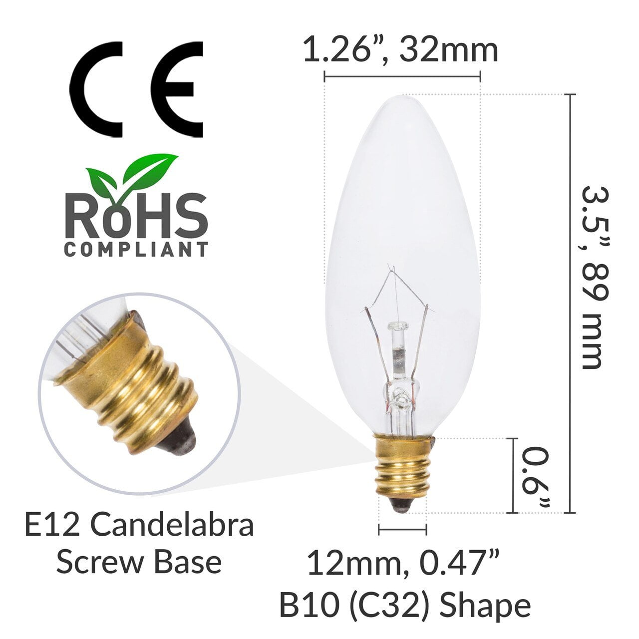 - E12 Candelabra Screw Base with 12mm or 0.47in diameter. Diameter: 1.26in or 32mm, Length: 3.5in or 89mm.