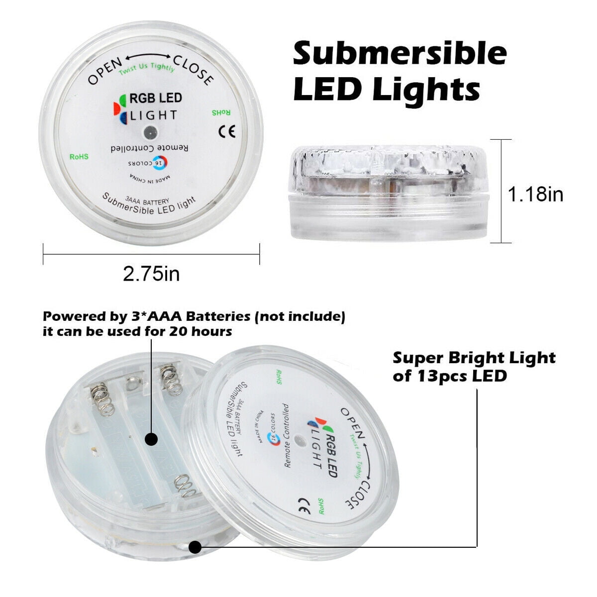 Adopts wireless power design, allows it safer to submerge in water and convenient to replace batteries when they run out.Utilizes 24 buttons to make you easily select your favorite colors, including 16 static RGB modes and 4 dynamic color modes.Equipped with a silicone waterproof ring and high-quality PS shell, our light is better to resist water, suitable for any containers full of water.