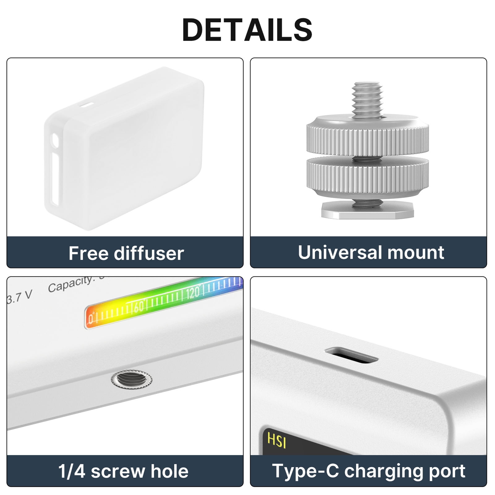 20 Special Light Effect Modes: 20 effects one-key switch, including ambulance, fireworks, TV, candle, party, strobe, RGB strobe, red flash, green flash, blue flash, HSI slow, HSI fast, etc, which providing you with more options for different applications.