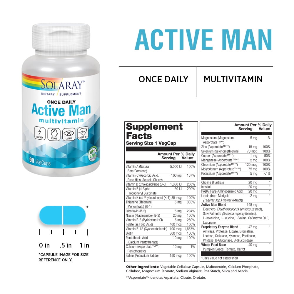 Solaray Once Daily Active Man Multivitamin & Mineral, Multivitamin for Cardiovascular, Support, Energy & Focus, Digestive Enzyme Blend, Amino Acids and Whole Food Base, 90 Servings, 90 VegCaps