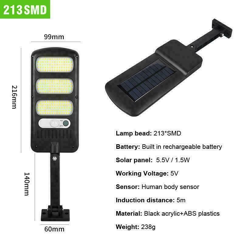 3 Light Modes: Super bright 213 LED solar light have 3 modes for your diverse needs:①Body Induction Mode, ② Body Induction Mode + Low Light Mode, ③ Low-light Mode.
