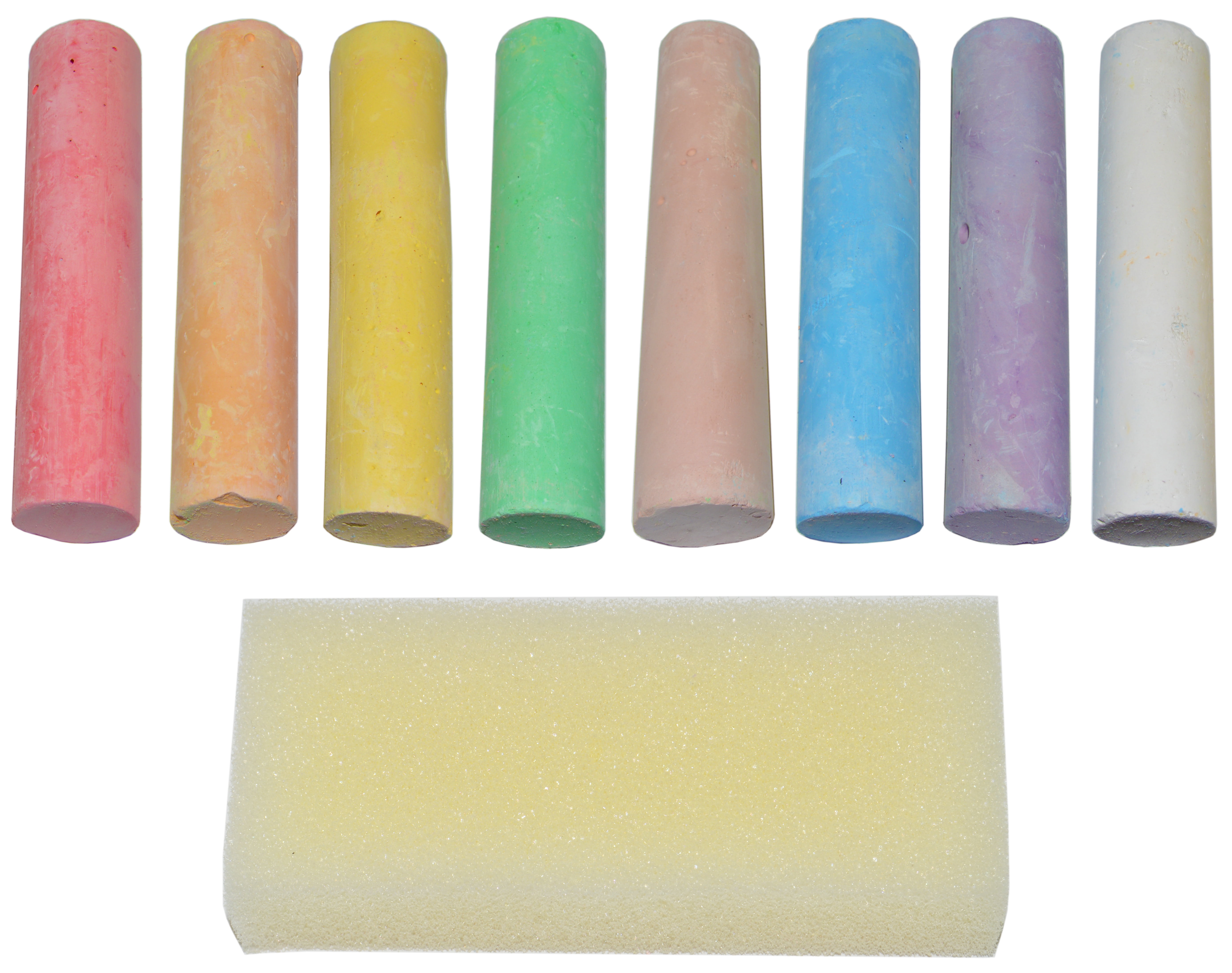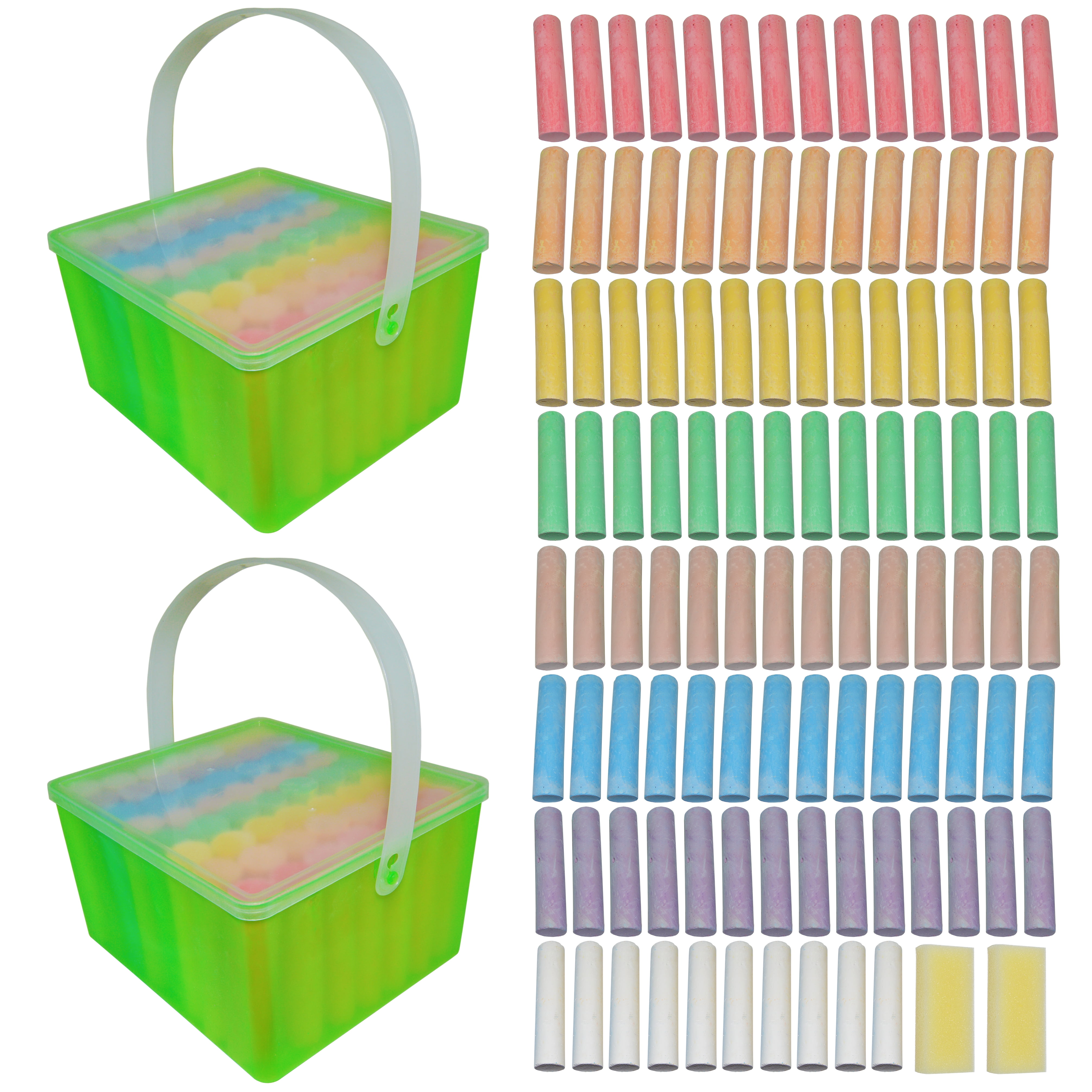 Children and adults alike will love drawing with these jumbo non-toxic sidewalk chalk sticks! You get fourteen of each of the following colors: Pink, Orange, Yellow, Green, Peach, Blue, and Purple. Ten sticks of White chalk and 2 sponge erasers are also included, along with two plastic storage boxes with handles. The jumbo sized sticks won’t break easily and wash easily from drawing surfaces, skin, and most clothing. For use on sidewalks, playgrounds, and driveways. Each stick measures roughly 3.8" long x 0.8" diameter. Each storage box measures 7.25" x 6.25" x 4.25".