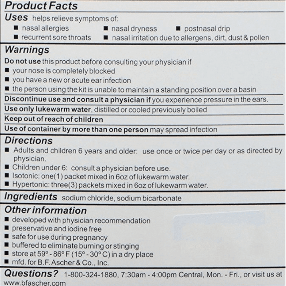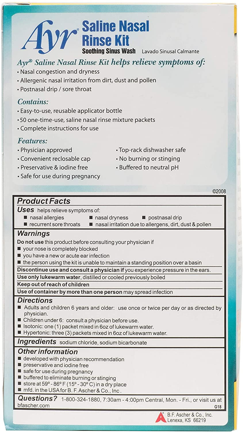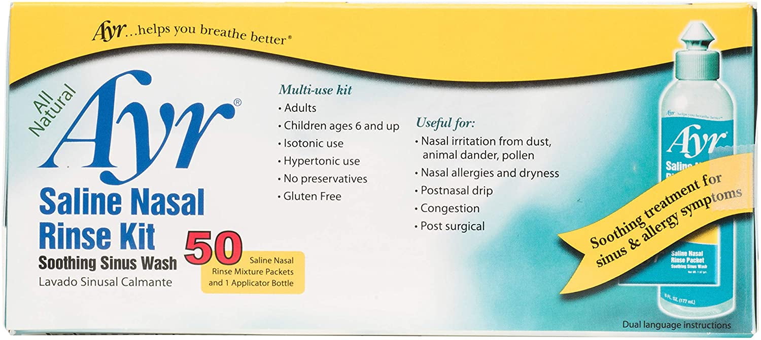 Ayr – helps you breathe better. No burning or stinging. Preservative free. Iodine free. Buffered to neutral pH. Safe for use during pregnancy. Contains: easy-to-use, reusable applicator bottle; 50 one-time-use sinus rinse mixture packets; complete instructions for use.