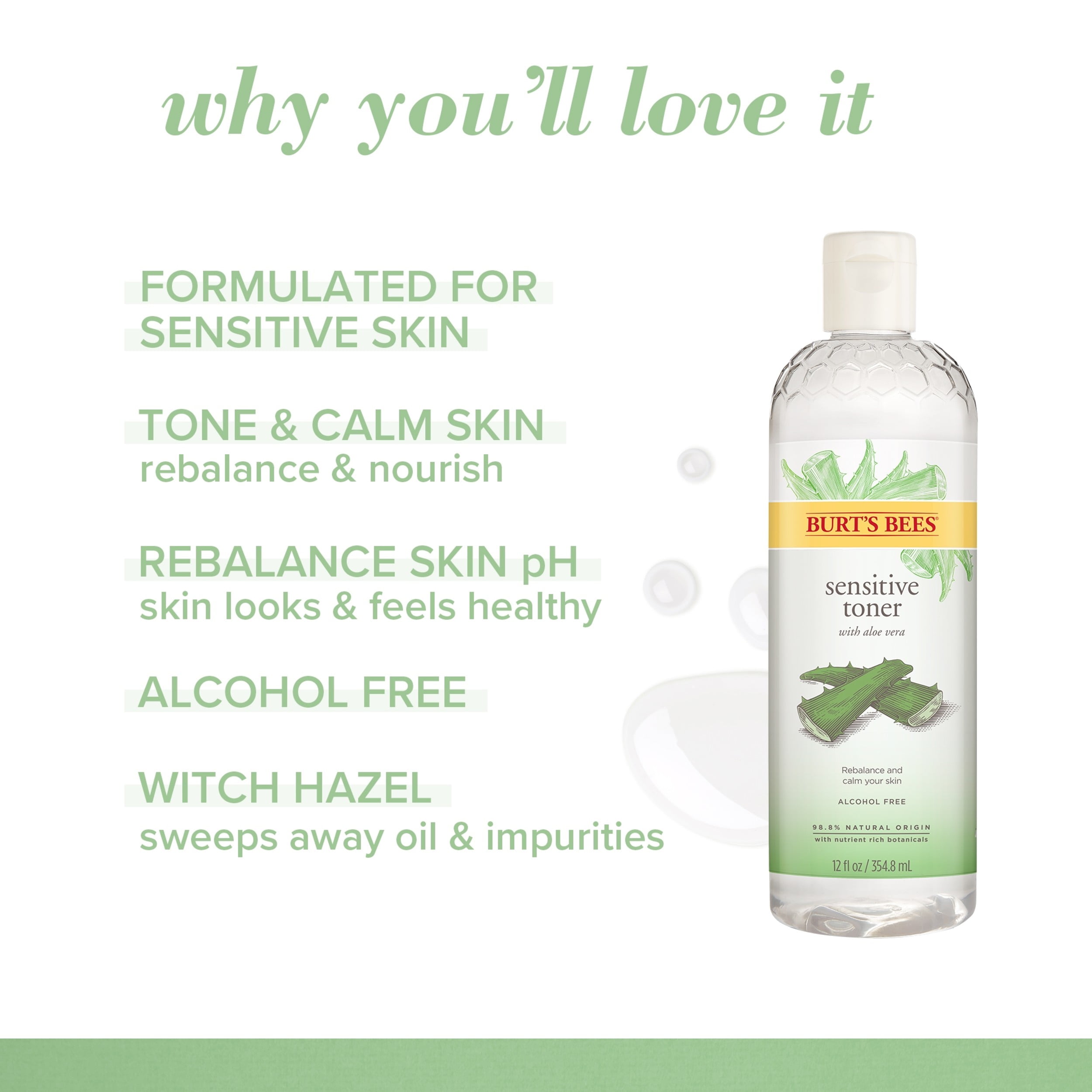 - SENSITIVE: People with sensitive skin can now work a toning step into their skin care routine with Burts Bees Sensitive Toner with Aloe, with is formulated specifically with sensitive skin in mind
