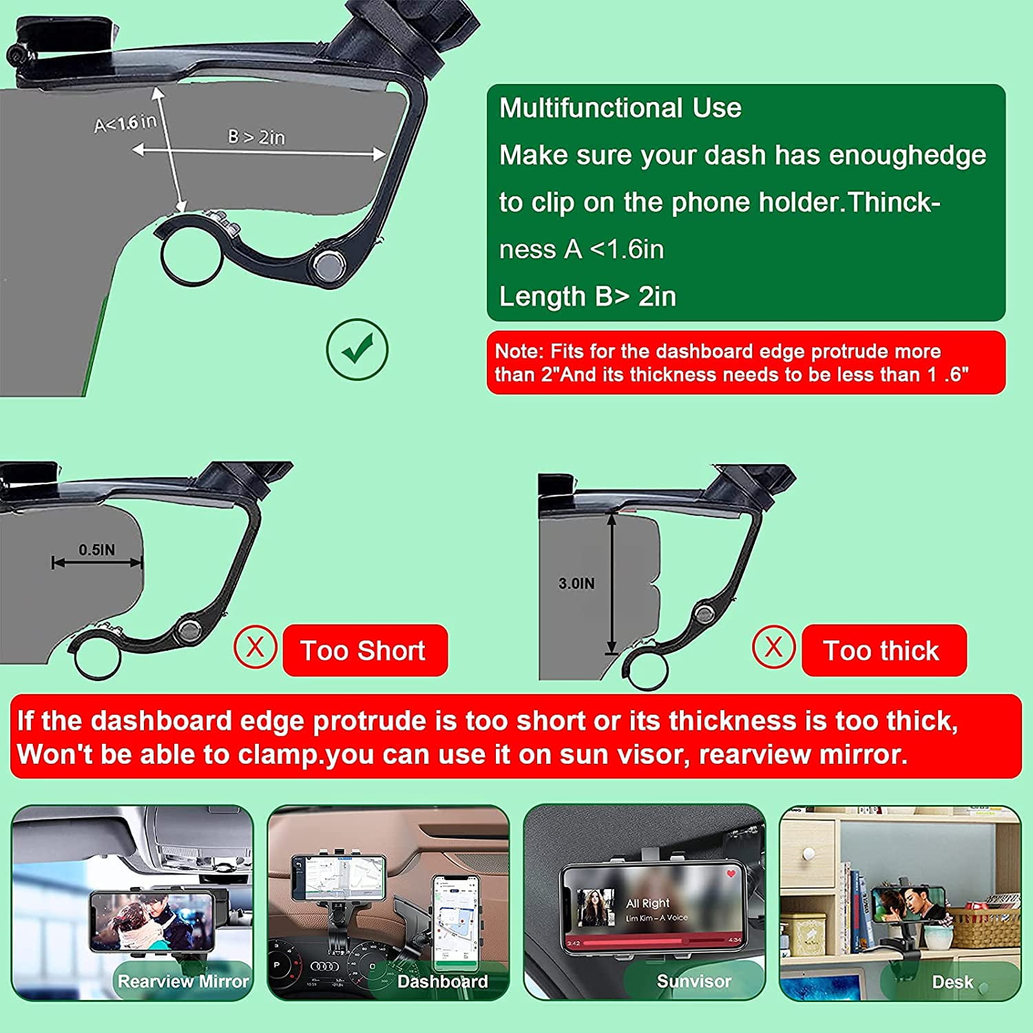 - 【One Car Holder For Multiple Purposes】This clip car mount more convenient, can be used in car dashboard, sun visor, rearview mirror. Multiple purposes can provide you with more convenience and more use needs in the car.