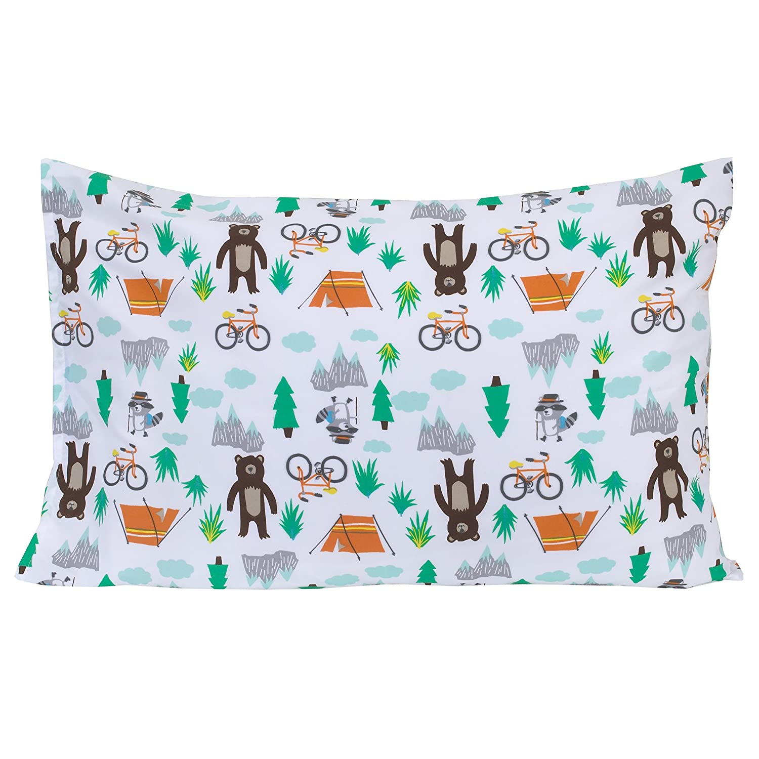 Gray and white plaid plus a colorful woodland theme make the a fun way to outfit your little camper’s big kid bedroom. This toddler bedding set includes a comforter, fitted sheet, flat sheet, and standard pillowcase. Pieces are made of a soft blend of cotton and microfiber polyester. Machine wash and tumble dry on low. 4-piece set of comforter, fitted sheet, flat sheet, pillowcase.