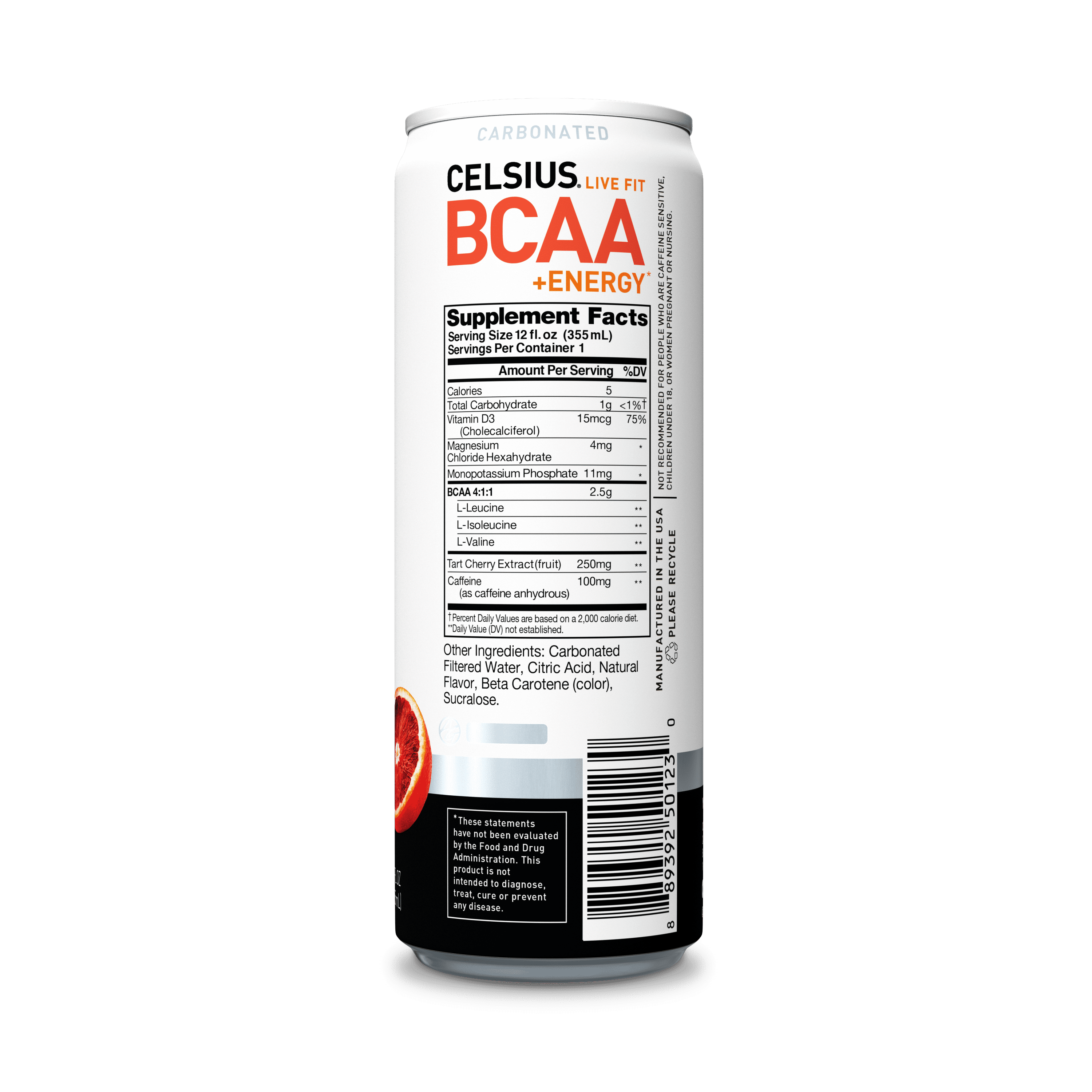 Redefine recovery with CELSIUS BCAA +Energy! This refreshing blend of BCAAs, Tart Cherry, Vitamin D3, Caffeine, and Electrolytes is designed to help replenish and rebuild, from workout to work. CELSIUS BCAA +Energy has just the right amount of caffeine to boost your endurance and help fuel muscle recovery without keeping you up all night. The drink contains no high fructose corn syrup, no aspartame, no preservatives, and no artificial colors or flavors. It has zero sugar and is made with BCAAs. Branched-Chain Amino Acids (BCAAs) are typically taken to help increase muscular growth and improve exercise and athletic performance. BCAAs can help reduce fatigue during and after exercise, reduce muscle damage and soreness, and support immunity. The addition of tart cherry gives the drink anti-inflammatory properties without affecting the delicious blood orange lemonade taste. Give your body the recovery it deserves after a hard workout; let CELSIUS BCAA +Energy help!