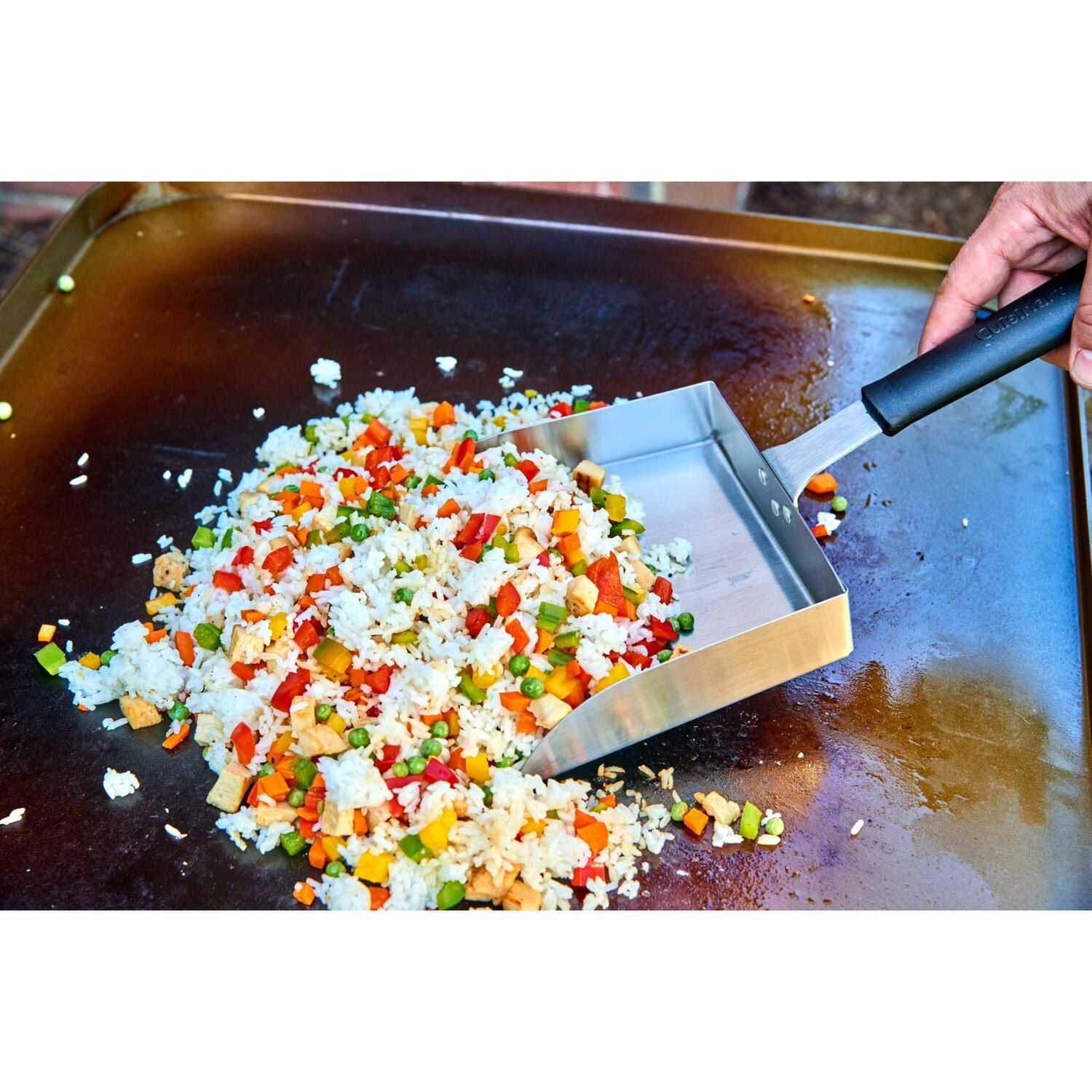 If you love making large quantities of food on your griddle, the Cuisinart food mover will be your next go-to spatula! The extra-large stainless steel shovel-like scoop makes it easy to scoop large quantities of food from the griddle cooking surface. Whether you are cooking scrambled eggs, home fries, or stir-fry, the griddle food mover will make it easier to transfer the food onto your serving dish! This handy scoop holds up to 5 cups of cooked veggies or rice, quickly clearing the griddle so you can start cooking the next round!