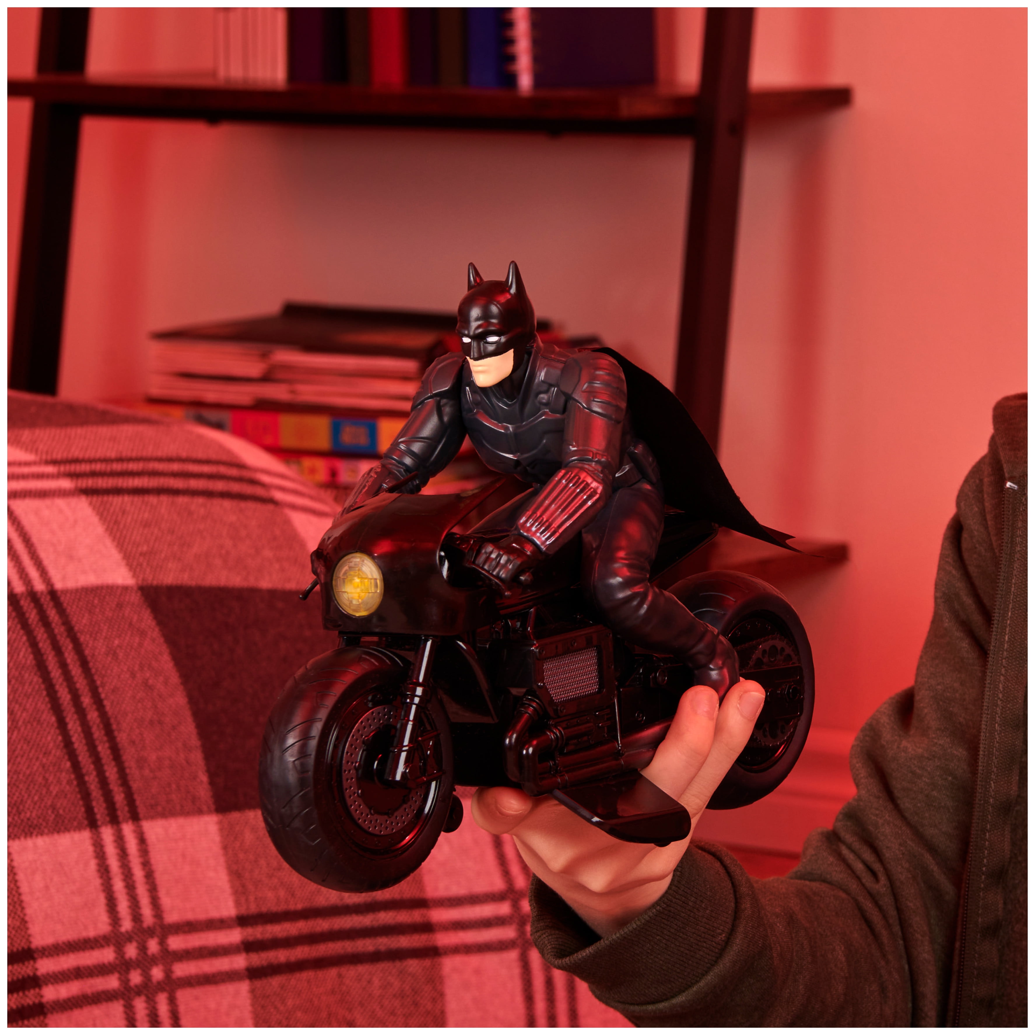 - BATCYCLE RC: Race into Gotham City with the remote-control Batcycle. This RC vehicle features an easy-to-drive remote control, authentic movie styling, working headlights and a fixed Batman rider figure!