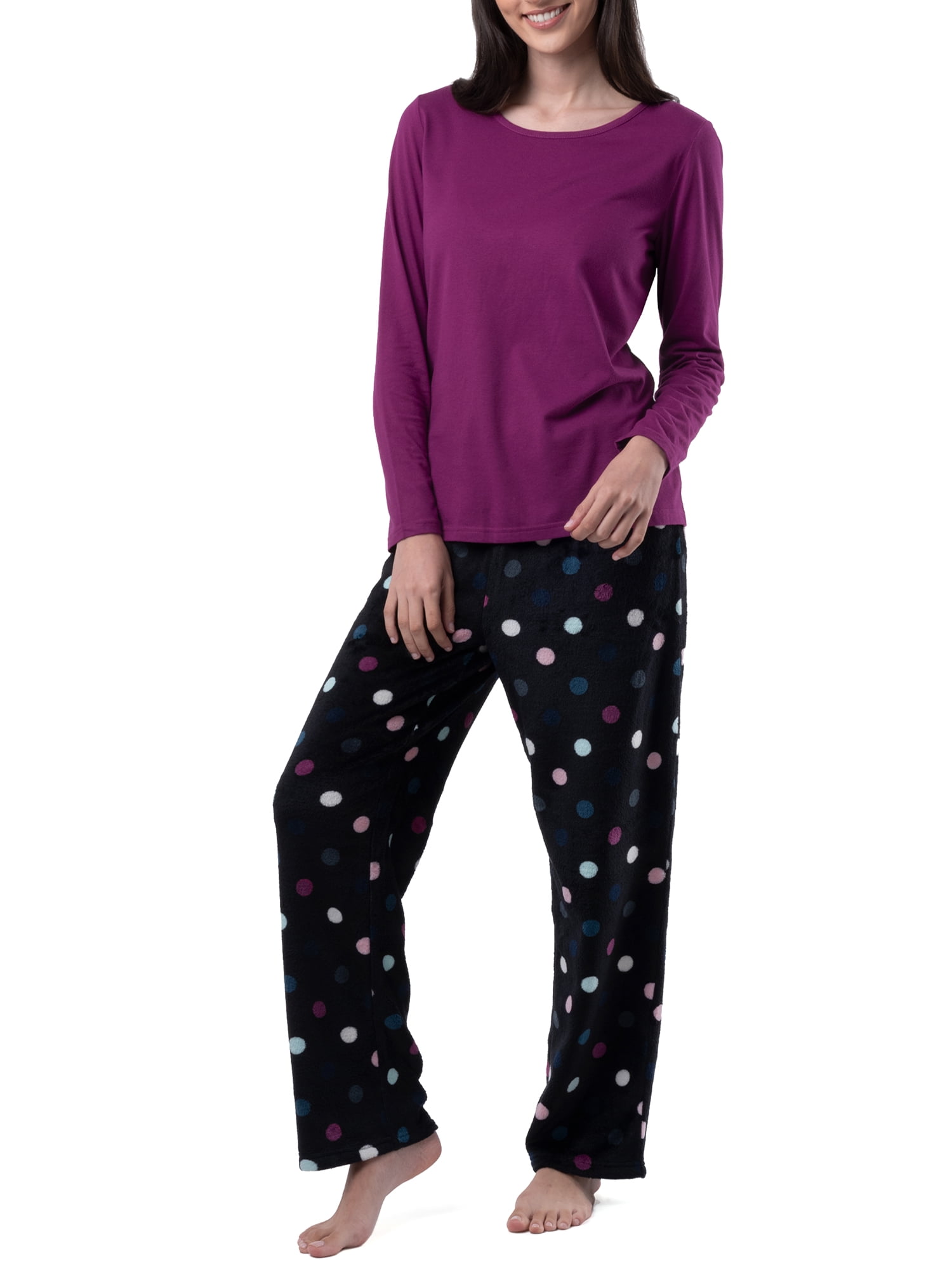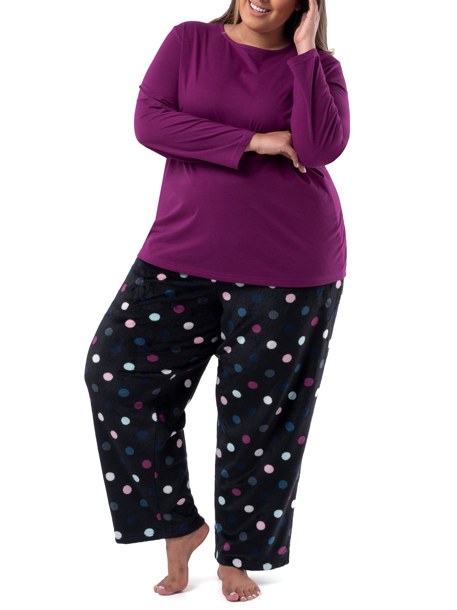 You cannot go wrong with this Fruit of the Loom Beyond Soft Women’s Soft Jersey Sleep Top & Fleece Bottom Set for your favorite pajamas this holiday. It is available in both missy and plus sizes and this set includes a long sleeve top made out of soft sueded cotton polyester fabric and a soft fleece polyester pant. The bottoms include an elastic waistband with a drawcord for ease in movement and comfort. Choose from a variety of holiday seasonal and fashionable prints. Sold as a banded giftable set, they make a perfect present for your friends and family.