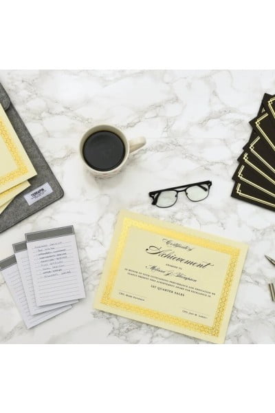 Celebrate the achievement of someone special in your life with this Gartner Studios 36004-S Gold Foil Certificate. These sophisticated 8.5” x 11” certificates are ivory in color and feature an elegant classic design. The beautiful gold foil border will elevate the presentation of these certificates. Use this Gartner Studios certificate to present a sports team award, honor an employee’s great achievement, celebrate a kindergarten graduation or to offer recognition to a special person that will leave a lasting memory the recipient will cherish. The fully customizable templates make it easier than ever to print your own special message, all in the comfort of your own home. Use with any standard home printer. This Gartner Studios certificate paper is available in a pack of 15. to find cards, stationery, invitations, envelopes, decorations, and more. Gartner Studios is your one stop shop for all your office needs.