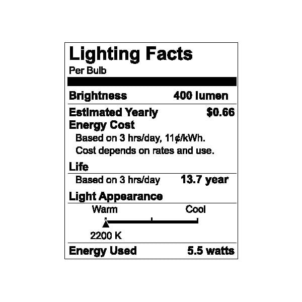 - 5.5-watt LED bulb (60-watt equivalent) with medium base and 400 lumens of brightness