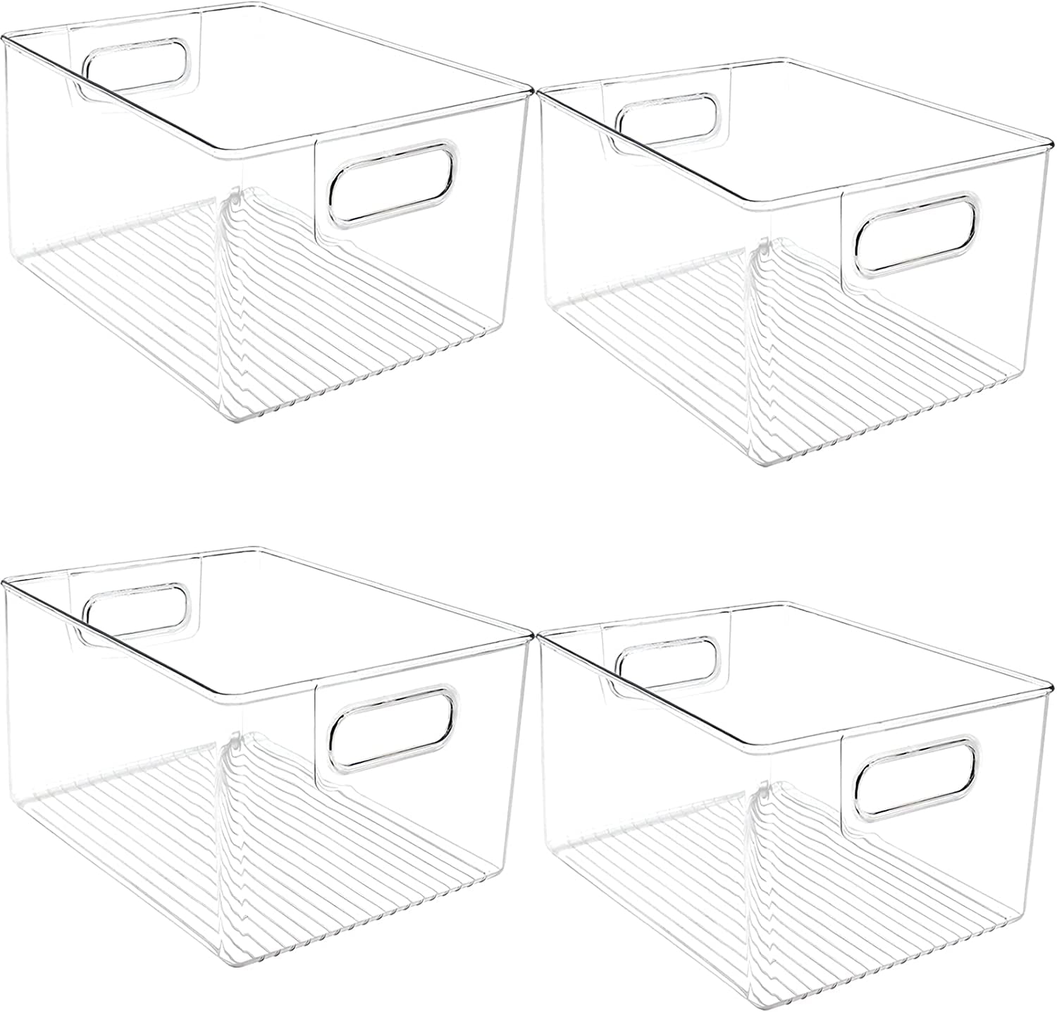 Set of 4 Stackable storage bins made of heavy-duty shatter-resistant material.