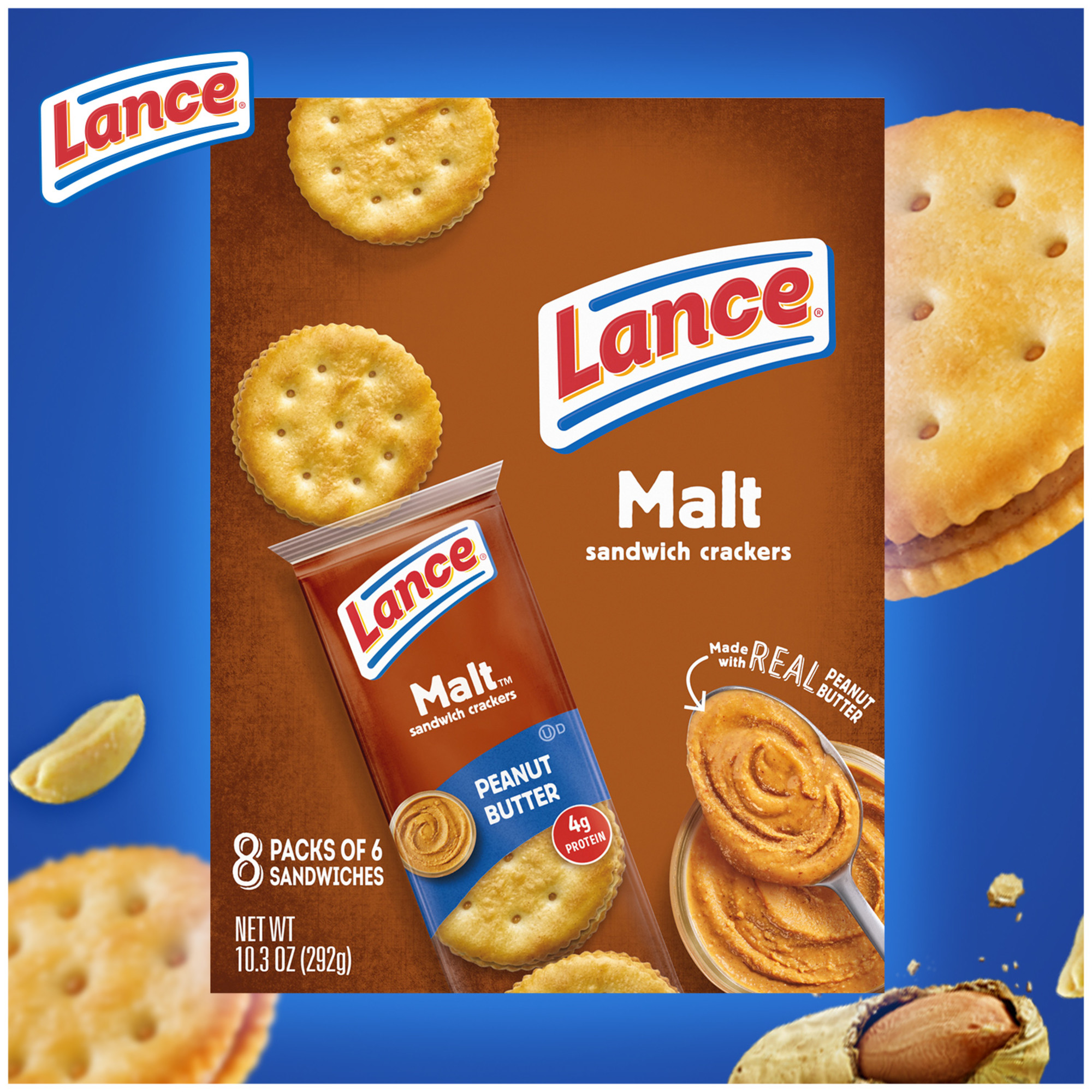 Nothing satisfies a snacking urge like Lance Malt with Peanut Butter crackers. We combined tasty, round malt crackers with real peanut butter filling smack-dab in the middle. Talk about snacking excellence! At Lance, sandwiches mean more: they aren’t just two somethings with whatever in the middle. Or, as we say, a Lance Sandwich cracker is two awesomes on the outside with totally incredible in the middle. Toasty Peanut Butter crackers put two of our fresh-baked malt crackers on the outside with real peanut butter filling we make ourselves in between. You get 8 cracker snack packs with 6 sandwich crackers per pack. That means you can enjoy a perfect snack for breaks, afternoon snacks, or whenever you’re hungry between meals. They’re also ideal for packing when you’re on-the-go snacking. You can grab all that malty, peanut goodness, any time. Lance has been fueling families for more than 100 years. Malt with Peanut Butter sandwich crackers are no exception. Lance Sandwich crackers, the king of all sandwich crackers. Bring it!