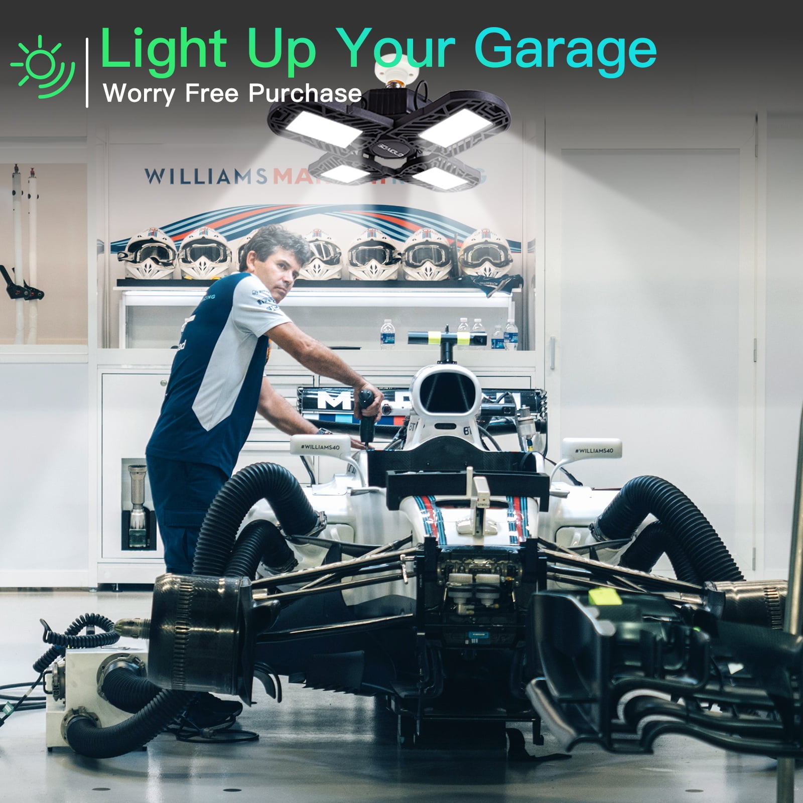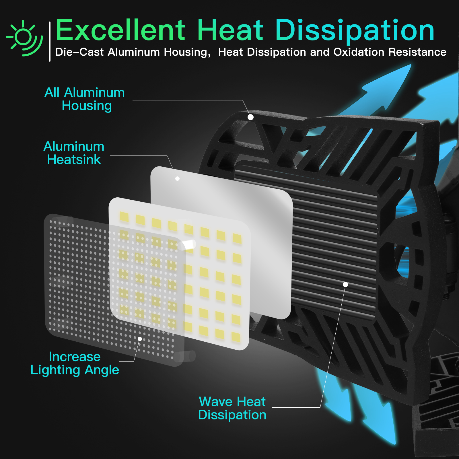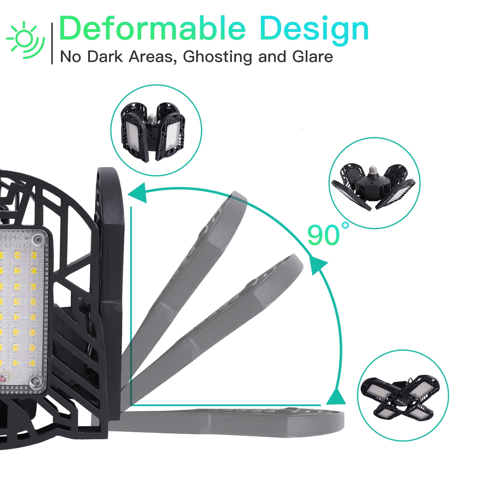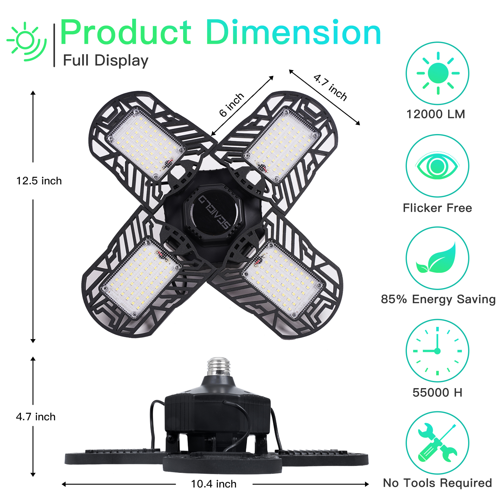 - 【Deformable design】:Seafield garage lamp is designed with 4 adjustable LED lamp caps, each lamp cap can be folded 90 degrees, so that the garage lamp covers 360 ° area, without dark area, ghost and glare.