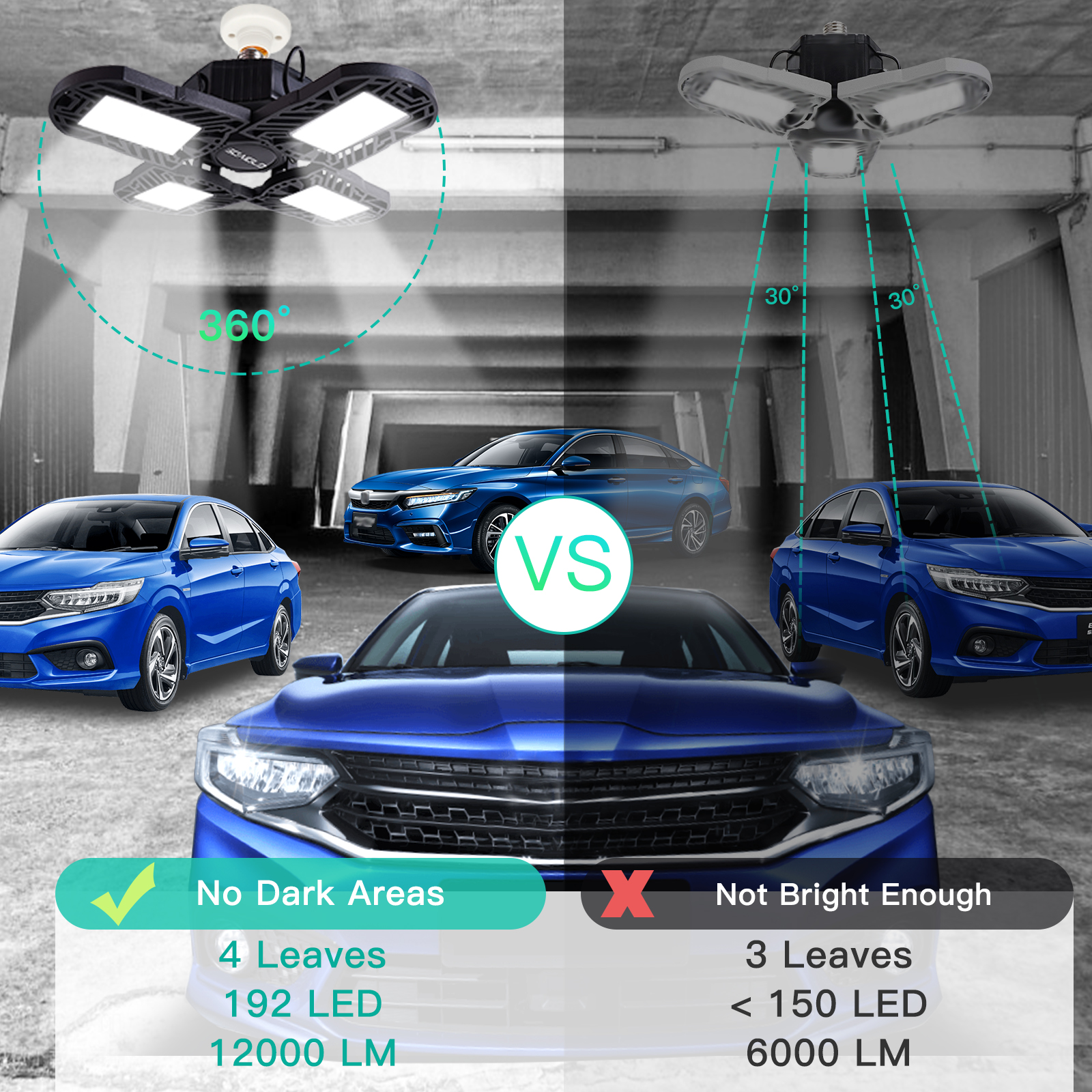 - 【Super ULTRA Bright LED Garage Lights】:Equipped with 192 Pcs upgraded top chips, 120w power consumption, CRI> 90, flicker free, illumination of 12000 lumens, and a color temperature of 6500k(daylight), the brightness is equivalent to 600 watts of incandescent bulbs, provide you with bright and comfortable lighting areas. Very suitable for your garage, basement, workshop, barn, wine cellar, warehouse, etc.