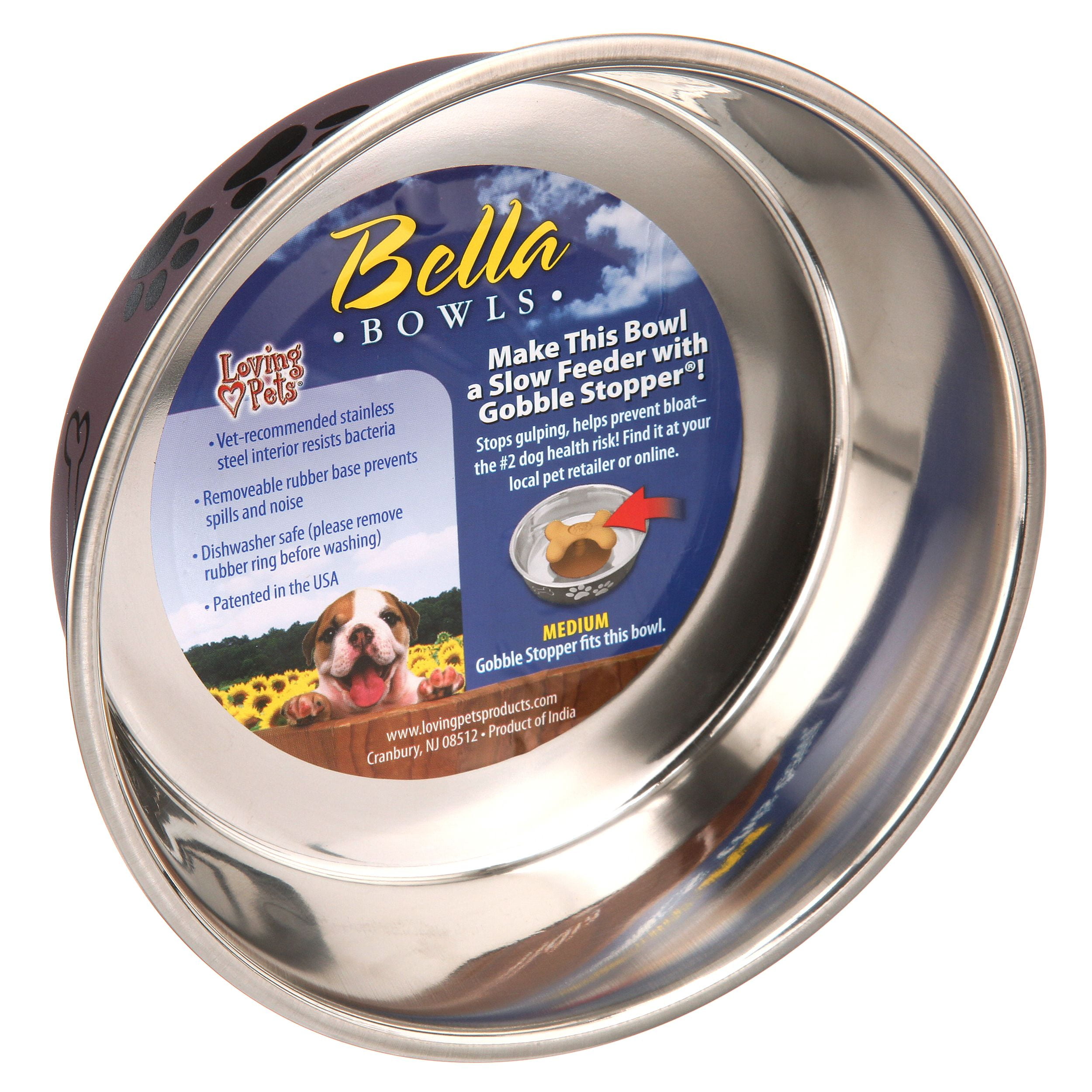 Keep your canine companion nourished or hydrated using the Loving Pets medium Bella bowl (Grape Metallic), it features a stainless steel interior that is not only durable but also resistant to the build-up of bacteria. This designer dog bowl is easy to clean. Its poly-resin exterior features a decorative color and distinctive paws and bones design. The included rubber base keeps the bowl from skidding on the floor as your dog eats or drinks, which also helps prevent spills, messes, and noise so your home is quieter and your floor is cleaner. Simply remove the rubber ring before washing it and then put it back in place afterward. Suitable for mid-size pets and breeds, this designer Loving Pets bowl adds a nice touch to your home decor.