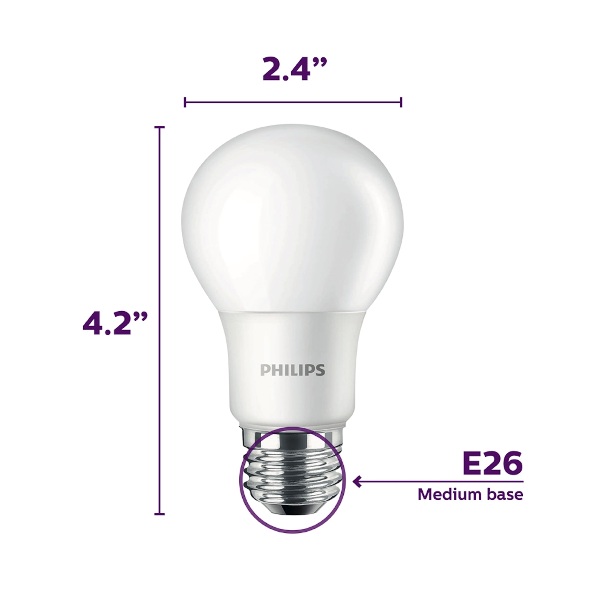 Providing a soft white comfortable light and perfect for general room lighting throughout your home, this Philips everyday A19 LED light bulb replaces your standard 60 watt bulb using only 8.5 watts of energy. With a lifetime of 10 years this bulb requires less frequent changes and is ideal for hard to reach places. It’s designed to deliver everyday value and ideal for table lamps and fixtures in the living room, dining room and bedroom.Philips LED Light Bulb, A19, Soft White, 60 WE, 4 Ct