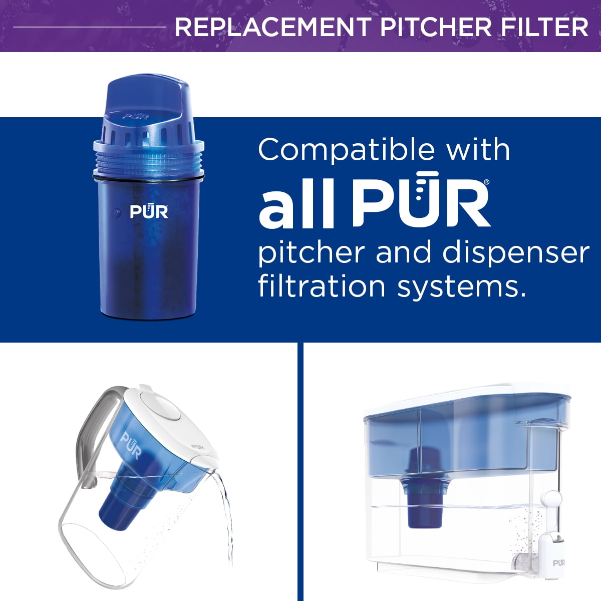 - All PUR pitcher filters fit in all PUR pitchers and dispensers.