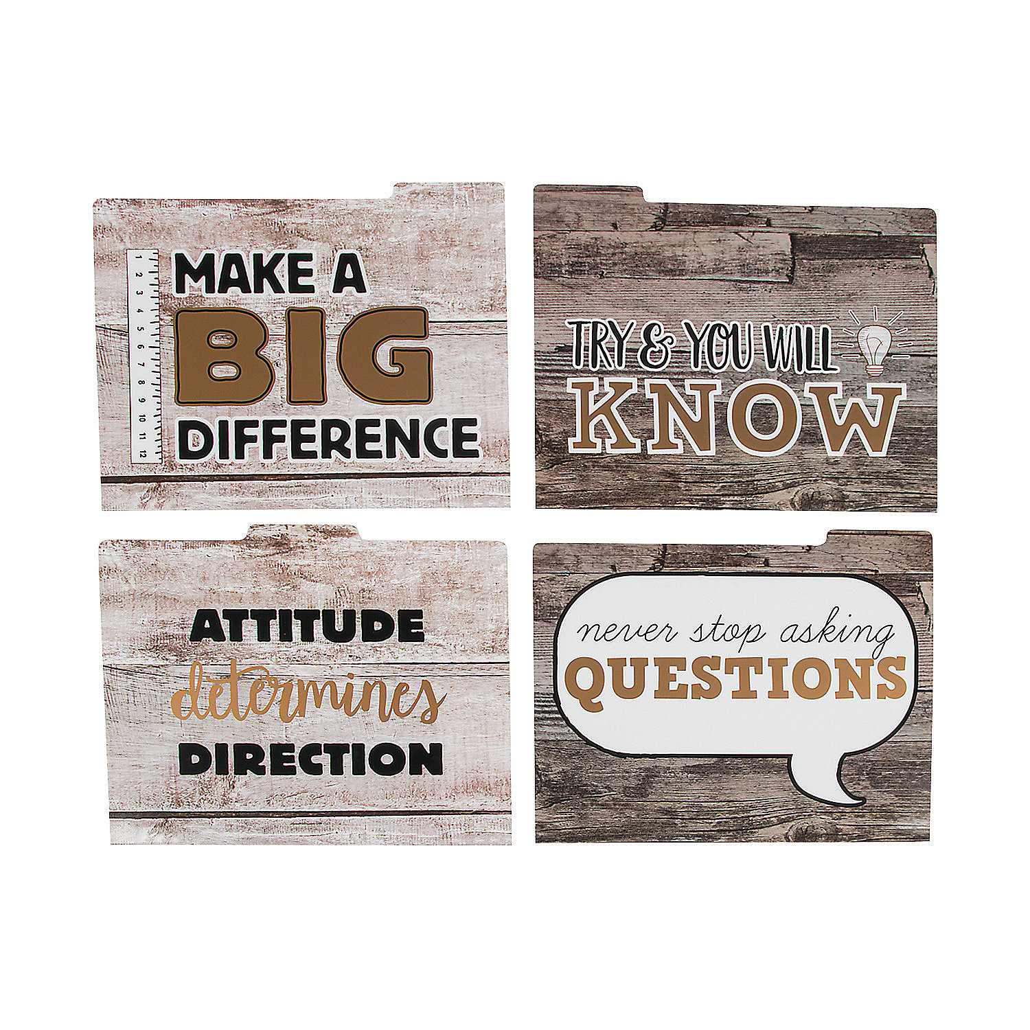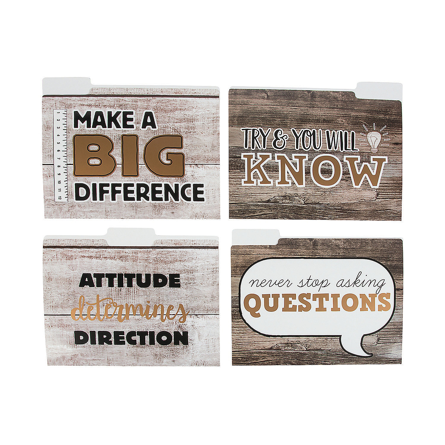 Add a little inspiration to your organizational tools with these rustic theme file folders. Each folder comes printed with an inspiring message. Use them as part of your own filing process or add them to classroom supplies for homework turn-in and so much more. Laminated on the outside.