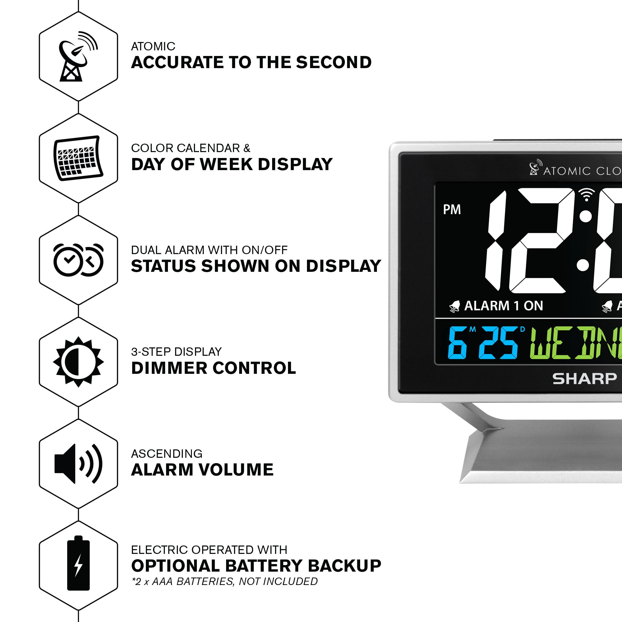 The Atomic Clock has a built-in receiver that automatically synchronizes itself with the WWVB radio broadcast by the US Government’s National Institute of Standards and Technology (NIST) in Fort Collins, Colorado. This Silver Atomic Clock will always be accurate to within on second as it receives daily WWVB updates. The Sharp (SPC569) Color Calendar and Day of Week Display – Always know what day of the week it is with a quick glance. The Digital clock displays the calendar and the day of the week. Using the Snooze/Dimmer switch on top of the display, you can easily adjust the display brightness to your liking.
