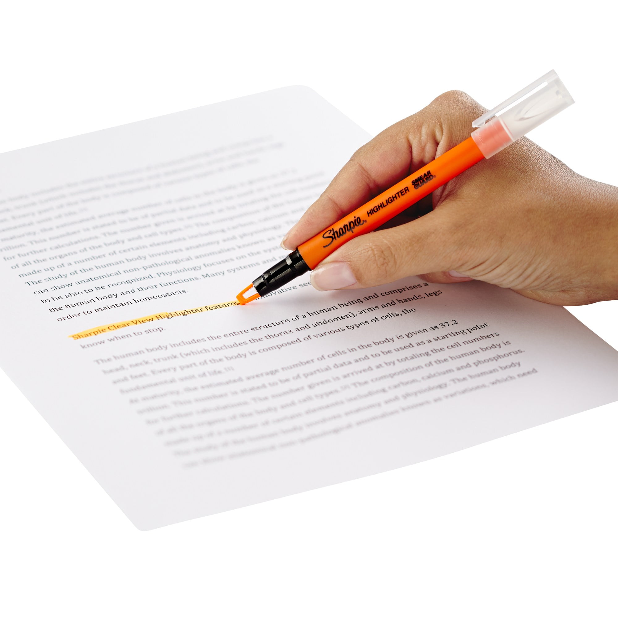 See where you’re marking with the Sharpie Clear View highlighter! A see-through tip allows you to keep your eyes locked on the page and precisely highlight-you’ll always know where to stop! Meanwhile, the innovative blade-style tip lets you switch between both wide and narrow lines. Sharpie highlighters come with ultra-vivid ink that jumps off the page while resisting the smearing of many pen and marker inks, so your work stays clean. Highlighter with see-through tip so you can highlight neatly and evenly Chisel tip lets you switch between both wide and narrow lines Ultra-vivid ink jumps off the page Resists smearing of many pen and marker inks so your work stays clean 8 colors included: Fluorescent green, 2 fluorescent yellow, coral, blue, pink, orange and purple Less harsh chemicals – made with fewer harsh chemicals, or safer chemicals than typical alternatives, helping reduce your use of and exposure to substances that may be more harmful to your health and the environment.See where you’re marking with the Sharpie Clear View highlighter! A see-through tip allows you to keep your eyes locked on the page and precisely highlight-you’ll always know where to stop! Meanwhile, the innovative blade-style tip lets you switch between both wide and narrow lines. Sharpie highlighters come with ultra-vivid ink that jumps off the page while resisting the smearing of many pen and marker inks, so your work stays clean