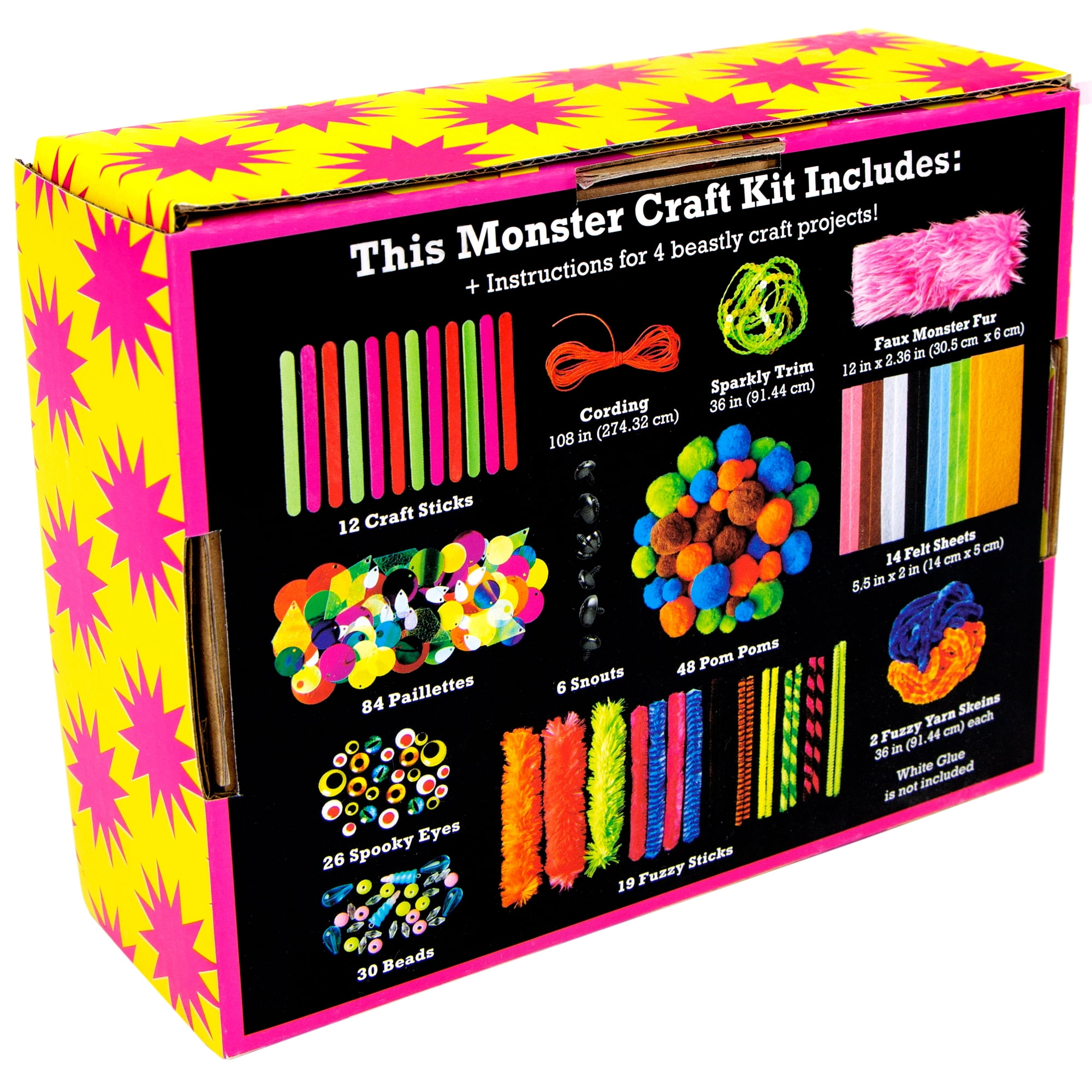 An assortment of spooky eyes and snouts, sparkling scale trim and fuzzy faux fur! This craft kit also includes instructions that show you how to create a goofy gremlin, a fanged friend, a crazy critter and a blue beast. Try making a monster from your imagination or one from your favorite movie or television show! Is your monster nice or grumpy? Does it prefer to hang out with people or other monsters? This product does not include glue.