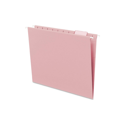 A popular choice for desk drawer files, these colored hanging folders keep papers neatly vertical in the file. Coated rod tips slide easily on file drawers. Included clear poly tabs can be positioned in the slits along the top edge in several locations. Repositionable poly tabs are 1/5 cut and 1/2" high. Hanging folders include replaceable white inserts. Use with colored interior folders to prevent misfiling. Hanging folders are made of 11 point color stock and include white inserts.