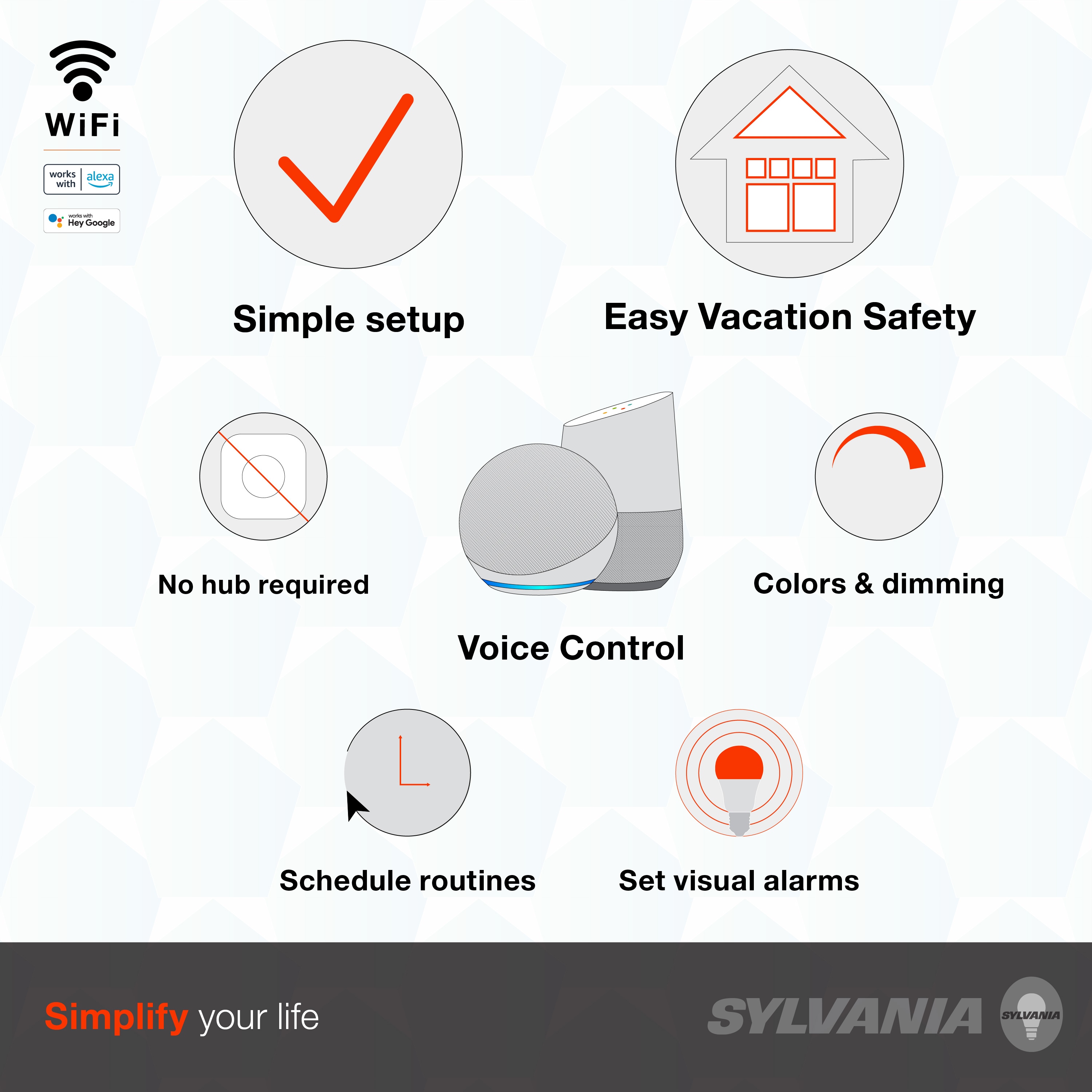 - Voice & Remote Control – Compatible with Alexa, Google Assistant, and Siri, manage your home lighting easily with your voice. If away, control your home lighting directly on the free SYLVANIA SMART+ App — no hub required.