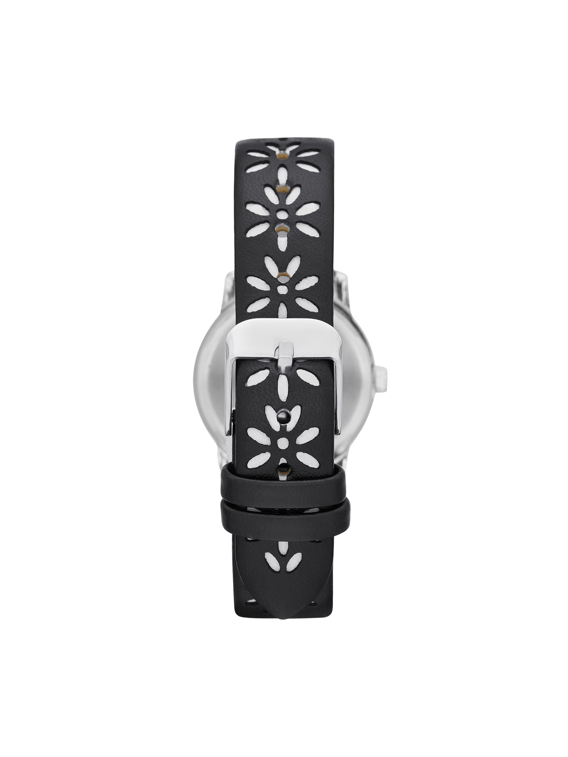 Time & Tru Ladies’ Silvertone Case, White Faux Mother of Pearl Dial, Black Floral Cutout Vegan Leather Analog Watch