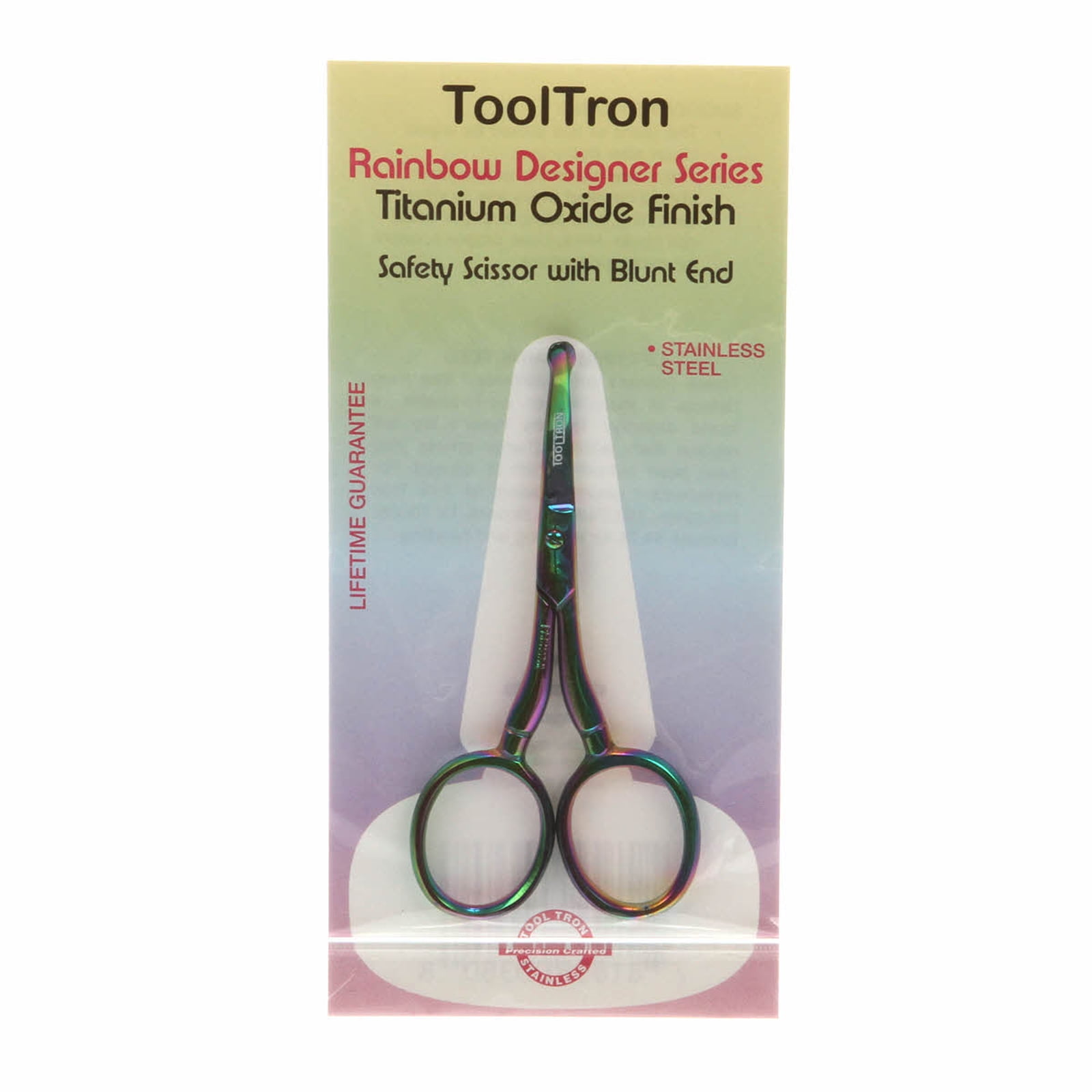 Tooltron 3 1/2 Inch Rainbow Curved Safety Scissors With Blunt End. Rainbow Designer Series. Titanium oxide finish. Safety scissor with blunt end. Blunt nib end prevents blade from poking and damaging materials. Stainless steel. Overall Length: 3 1/2 inches. CHK-TT00380Tooltron 3 1/2 Inch Rainbow Curved Safety Scissors With Blunt End