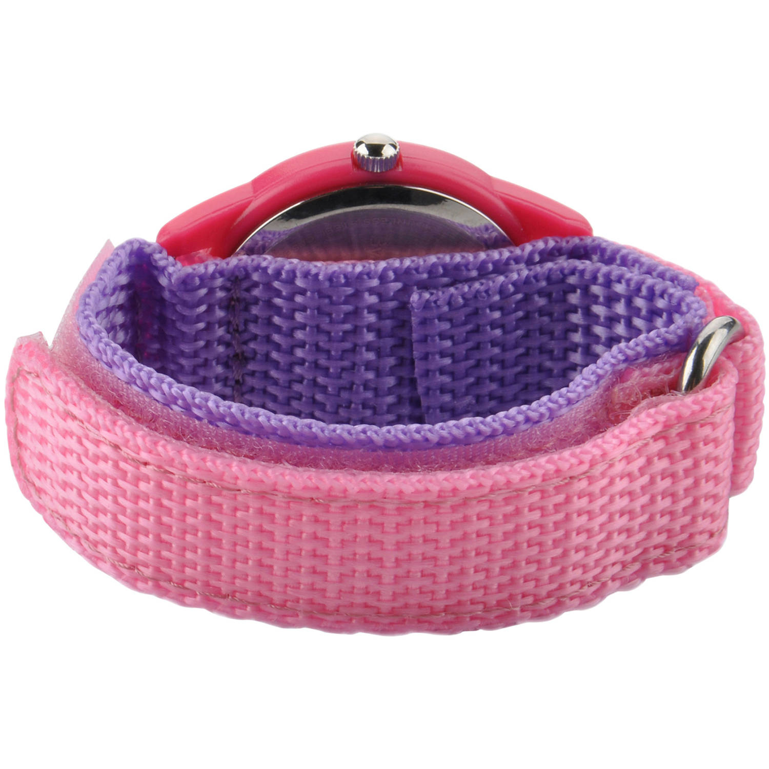 Princess Belle Girls’ Pink Plastic Time Teacher Watch, Pink Hook and Loop Nylon Strap with Purple Backing