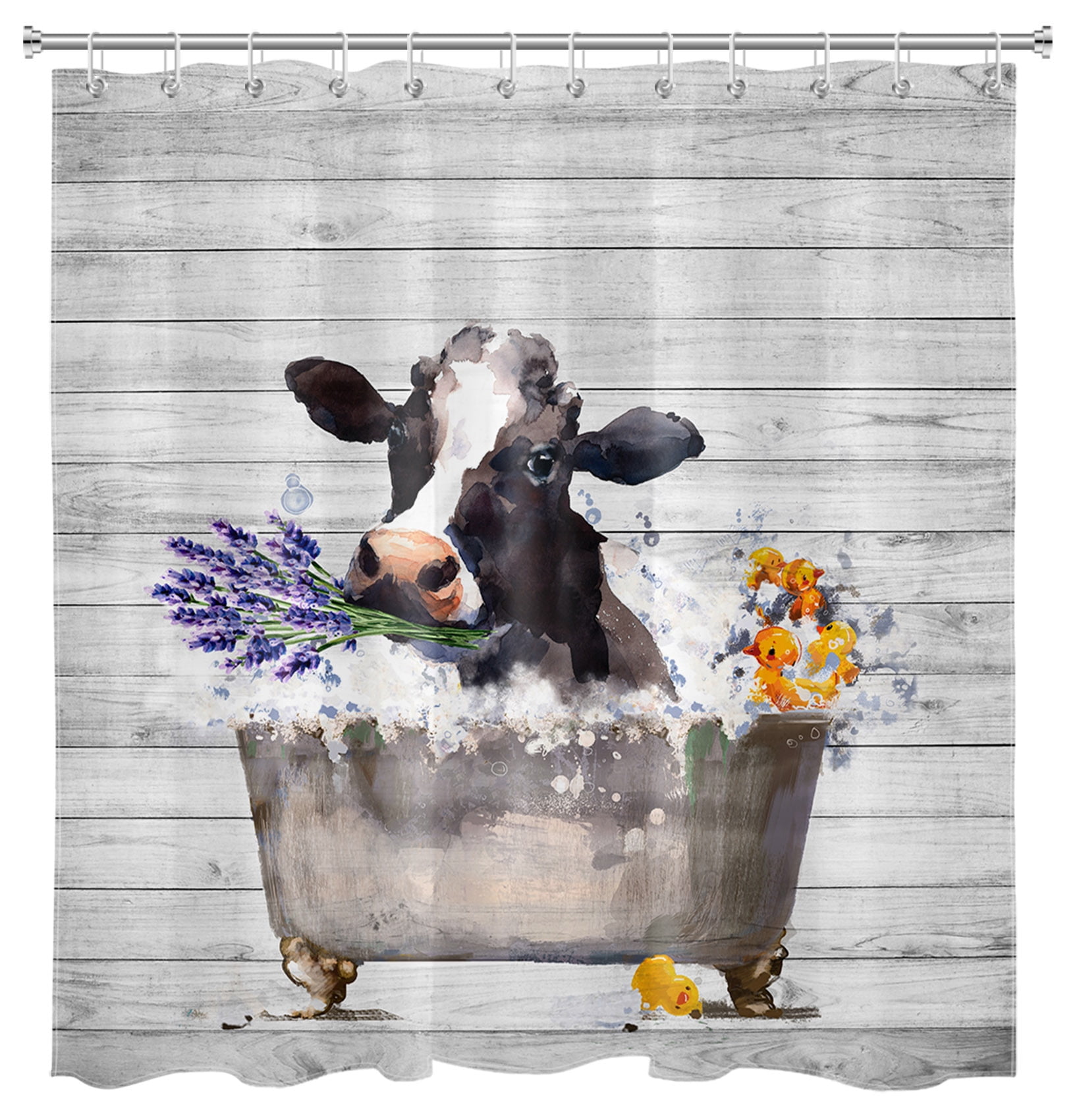 HVEST Funny Cow Get Naked Shower Curtain Farmhouse Animal Bull and Purple Lavender Floral in Retro Bathroom Shower Curtain,Polyester Waterproof Durable Fabric Bath Accessories with Hooks 72×78 Inches