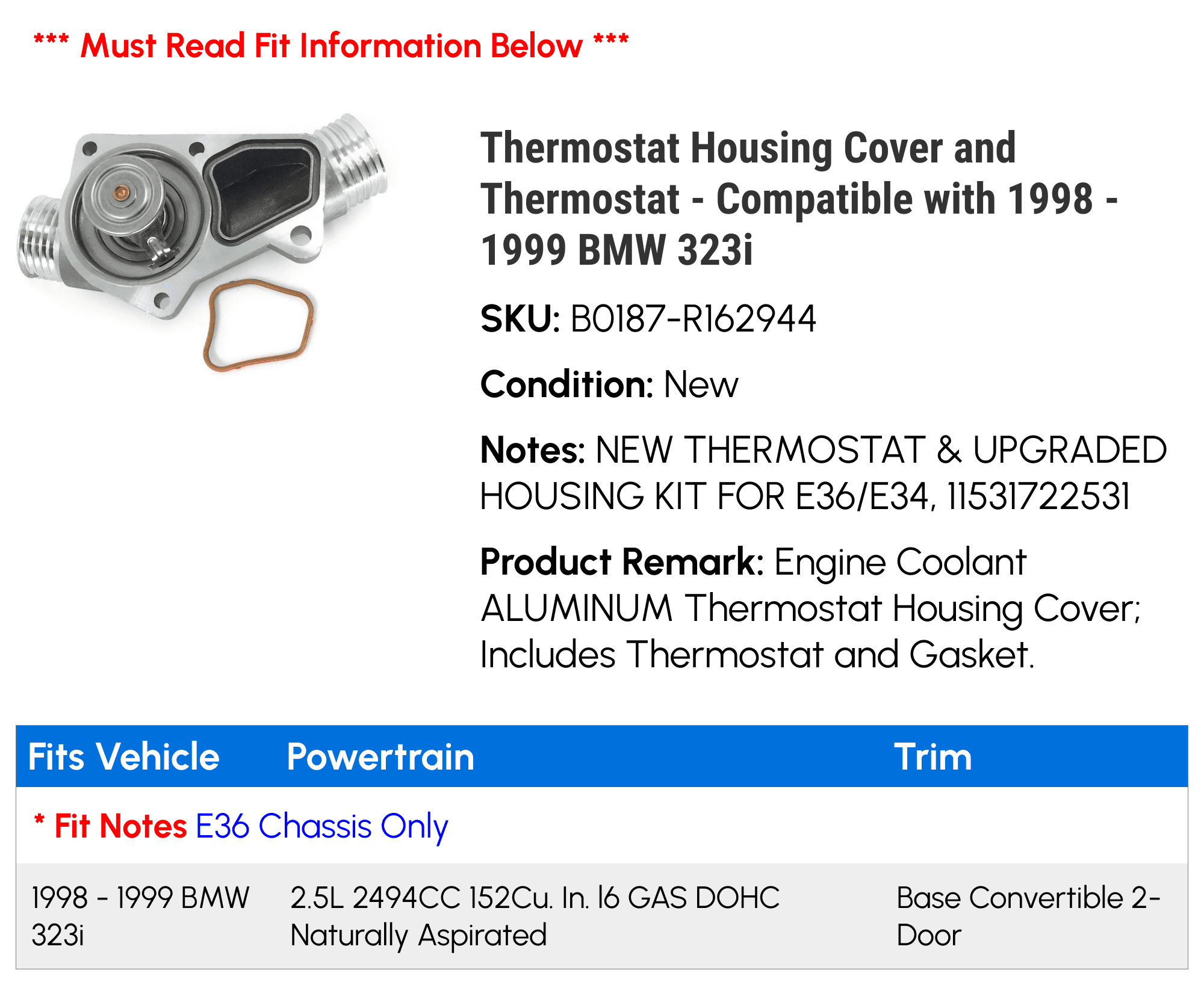 Thermostat Housing Cover and Thermostat – Compatible with 1998 – 1999 BMW 323i