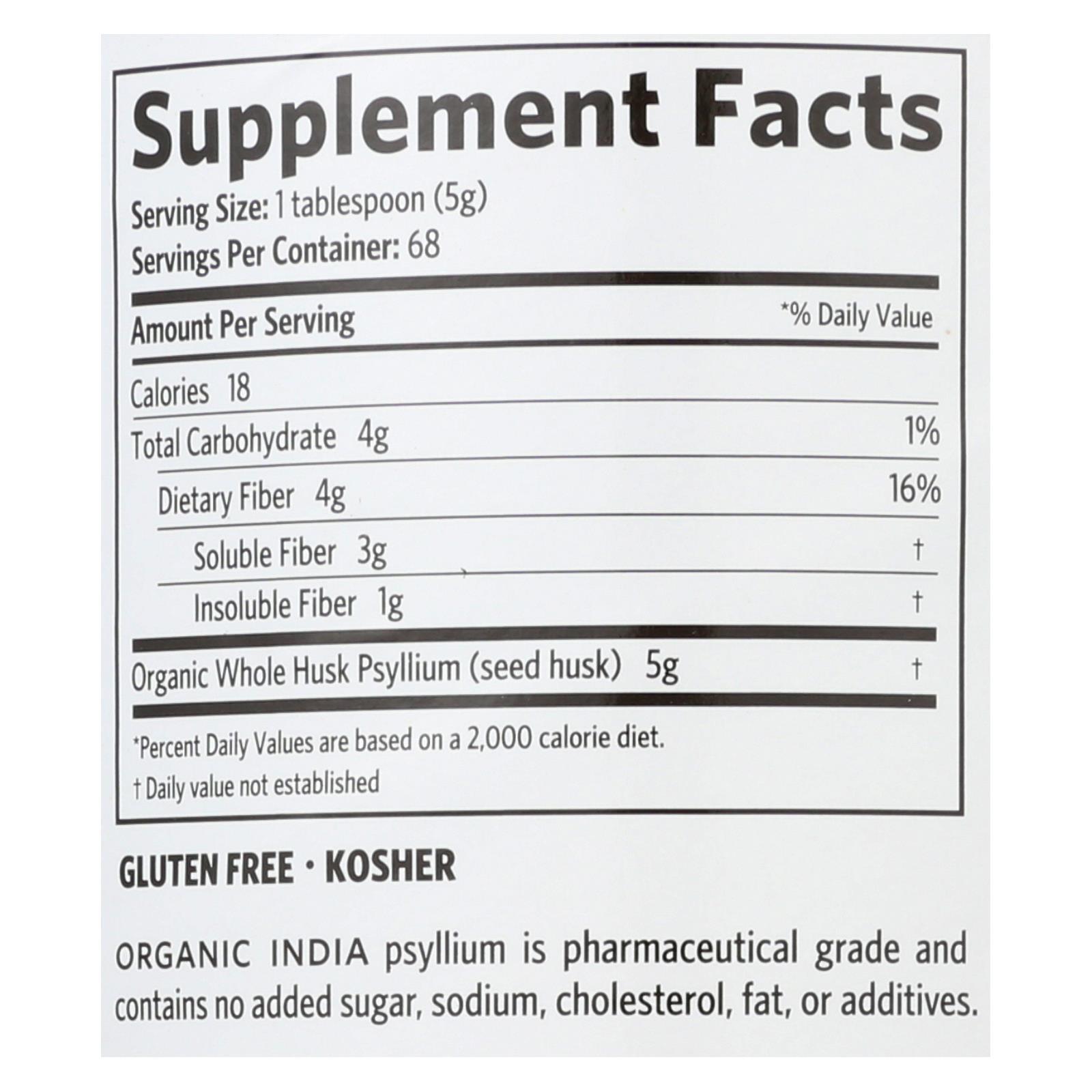 Organic India Psyllium, Whole Husk 100% Certified Organic Fiber, Natural Dietary Fiber, 12 oz