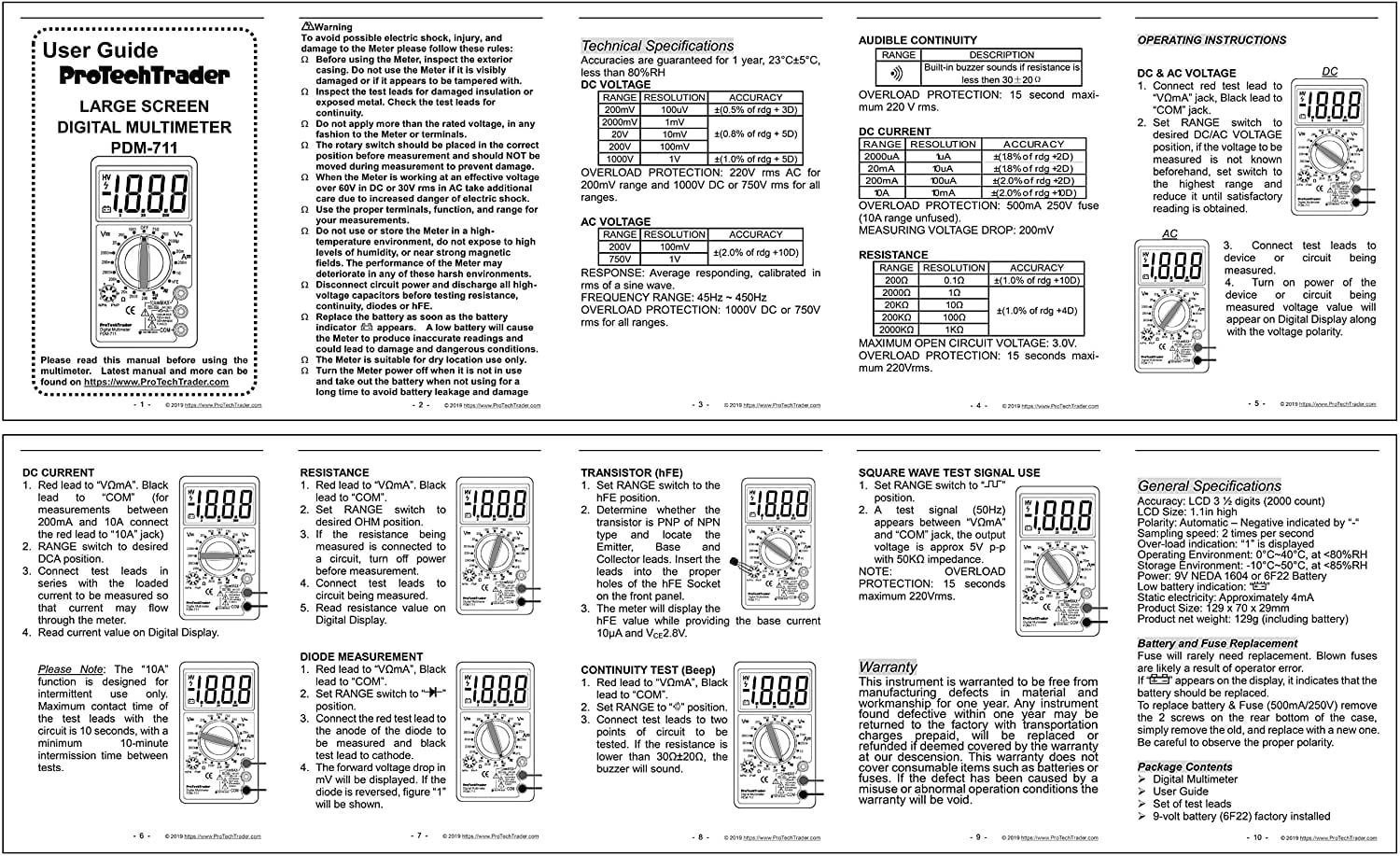 Large Screen Digital Multimeter – Volts Ohms Amps Transistor (hFE) Square Wave Output Diode & Audible Continuity Tester with Buzzer