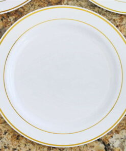 10 Pack 10′ White Round Disposable Plastic Dinner Plates With Gold Rim